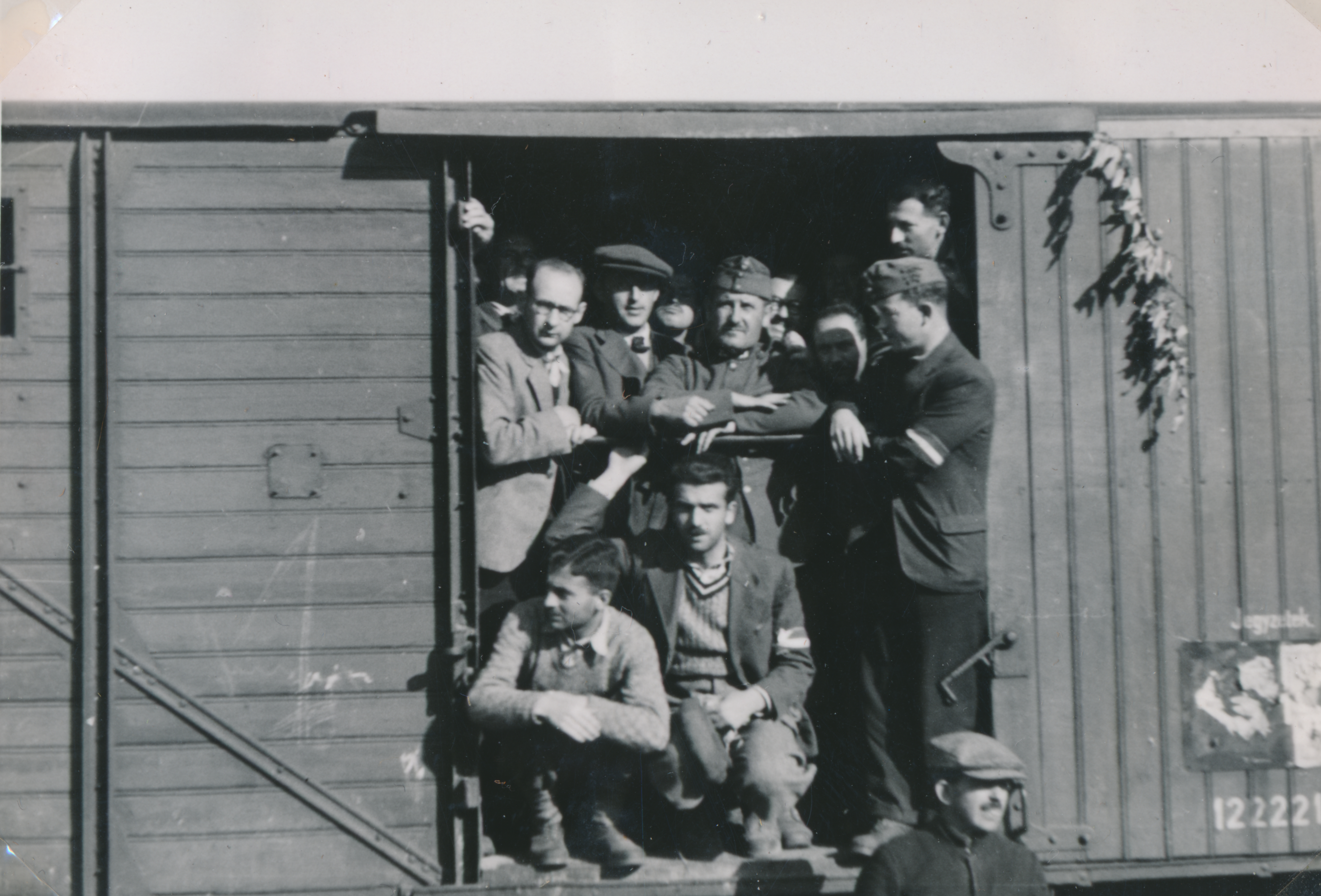 Csoportkép munkaszolgálatosokról és egy tisztről egy marhavagonban