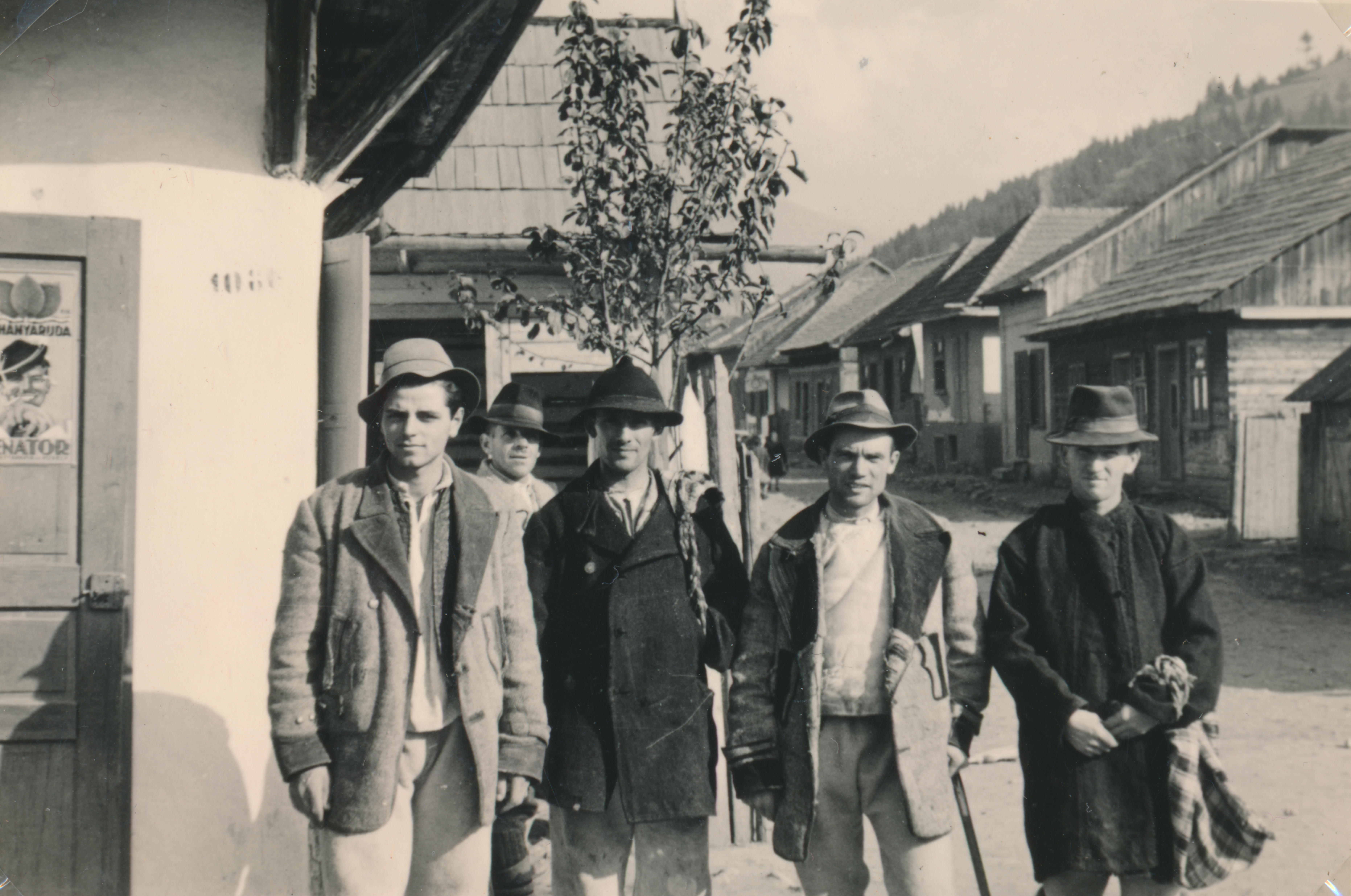 Csoportkép román parasztokról a bolt előtt