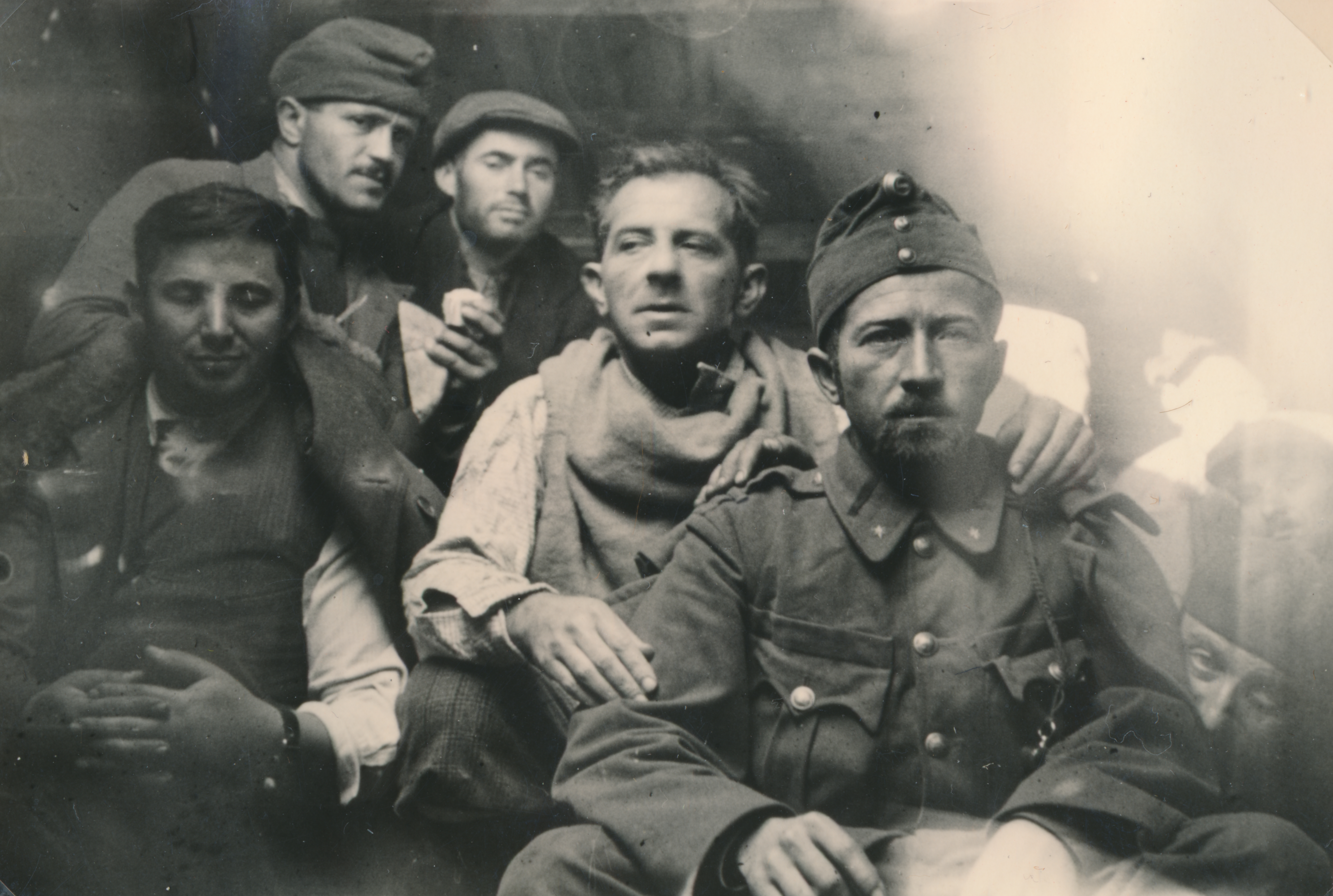 Csoportkép munkaszolgálatosokról és egy őrről a kajiba belsejében