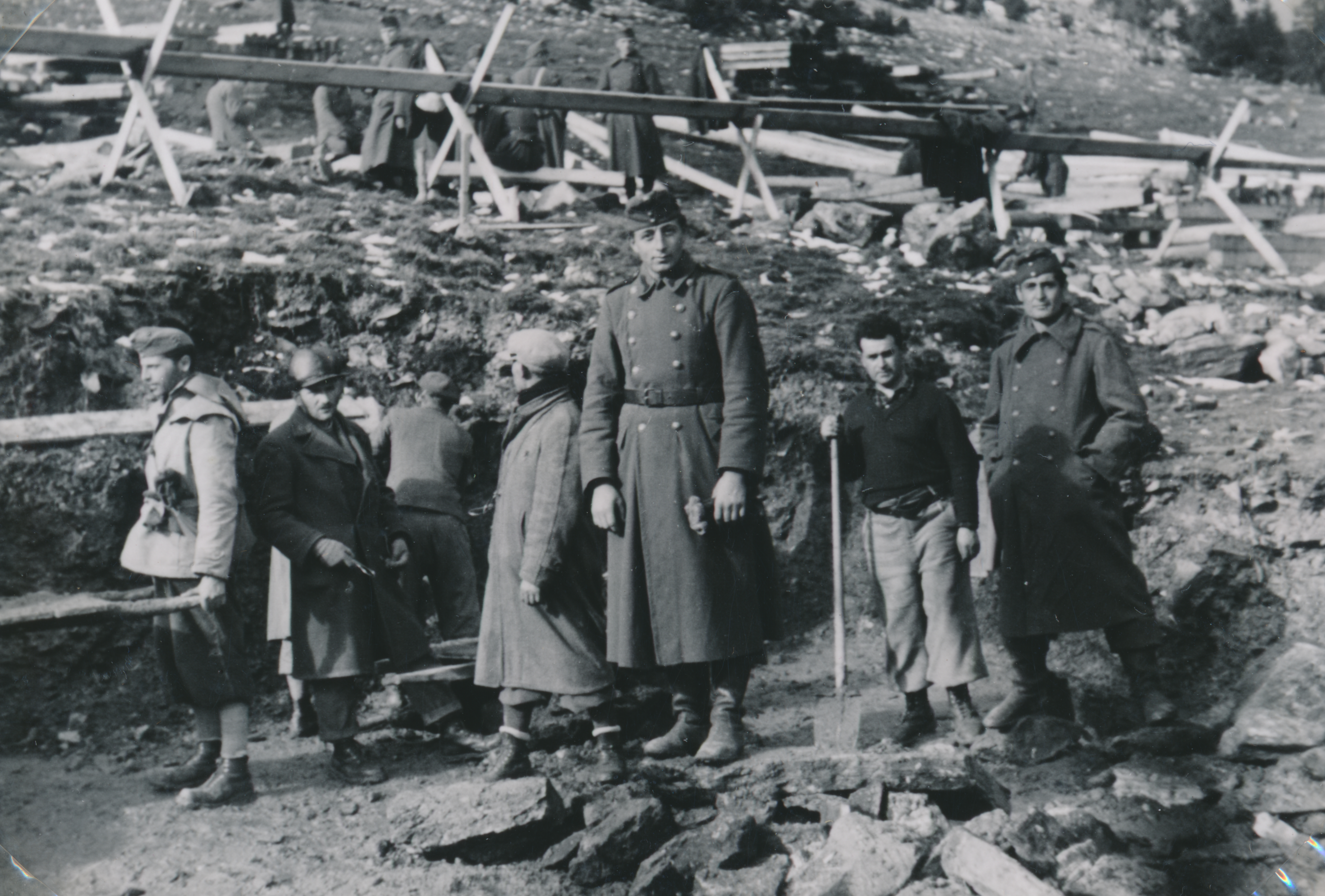 Munkaszolgálatosok földmunkán dolgoznak, középen egy tiszt áll