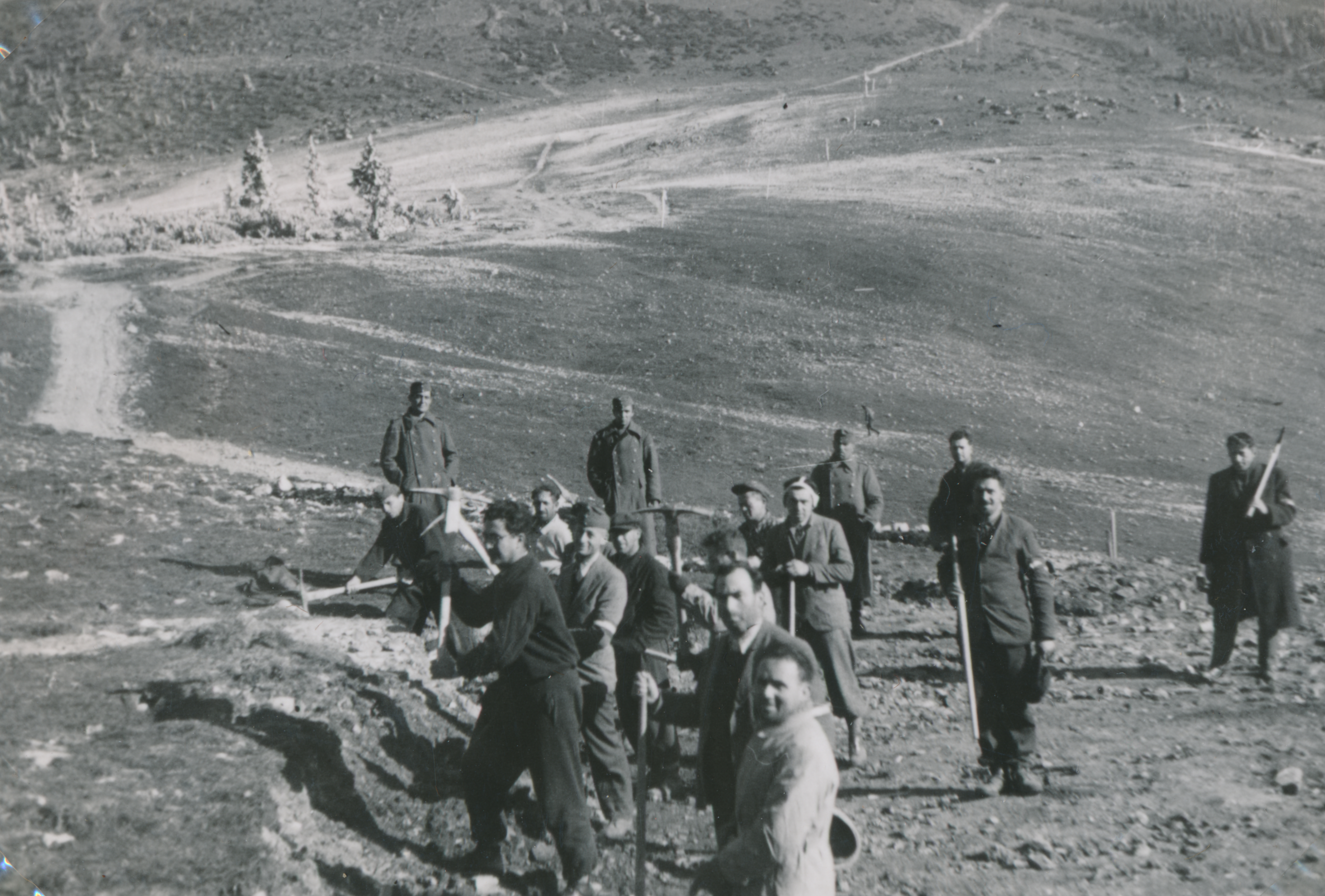 Munkaszolgálatosok csákányoznak a hegyoldalban