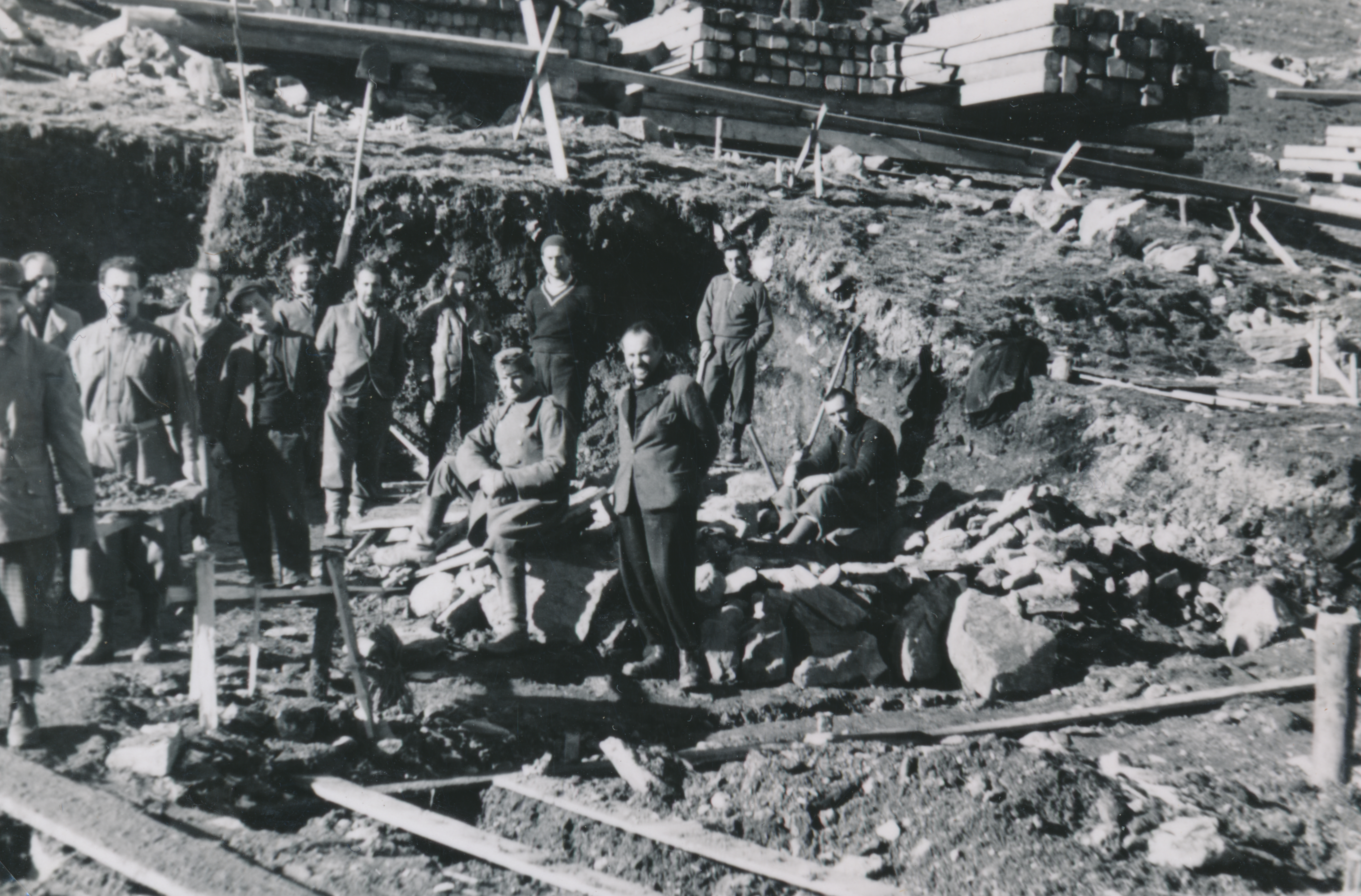 Csoportkép munkaszolgálatosokról egy alapgödörben
