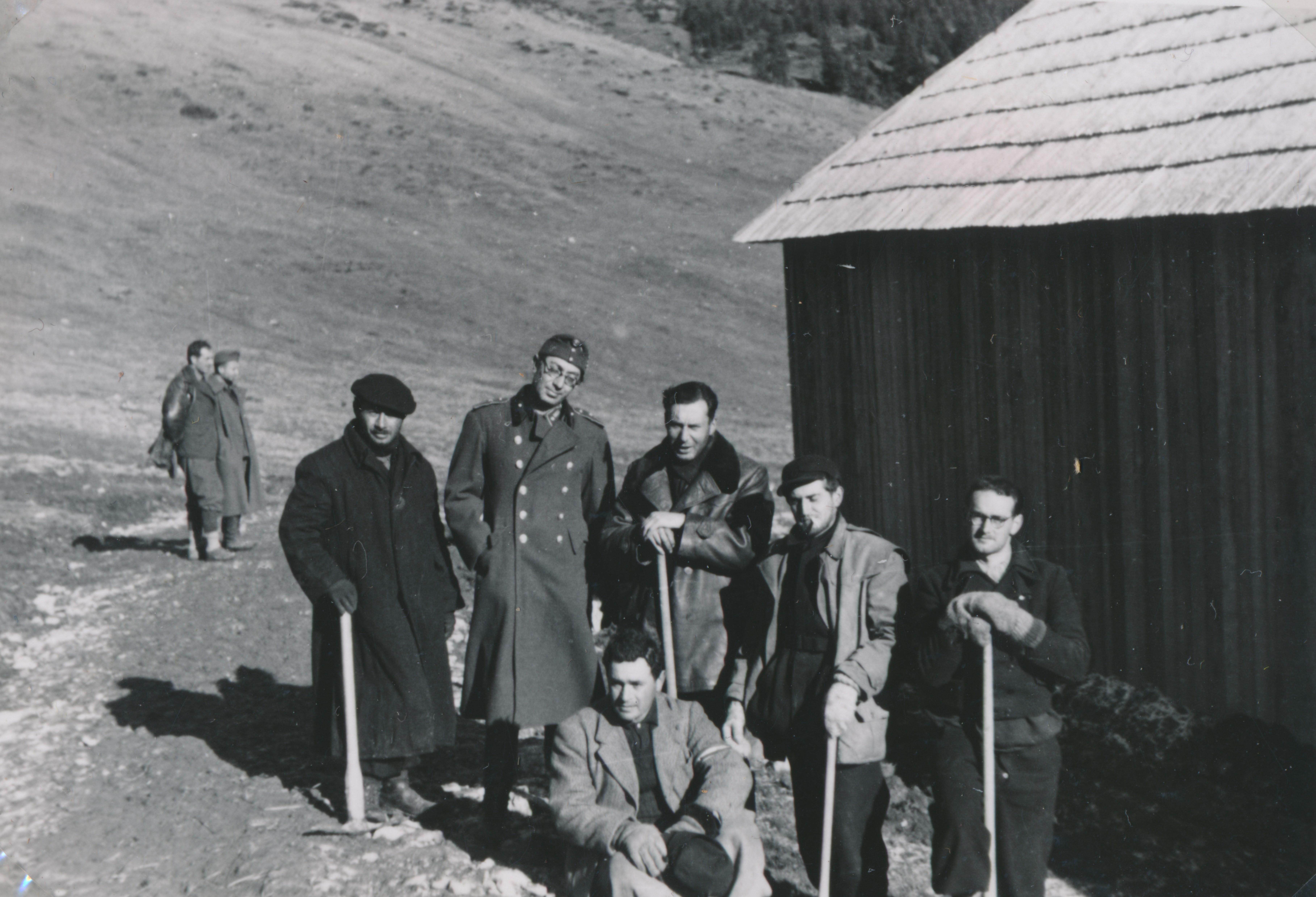 Munkaszolgálatosok és egy tiszt a barakk előtt