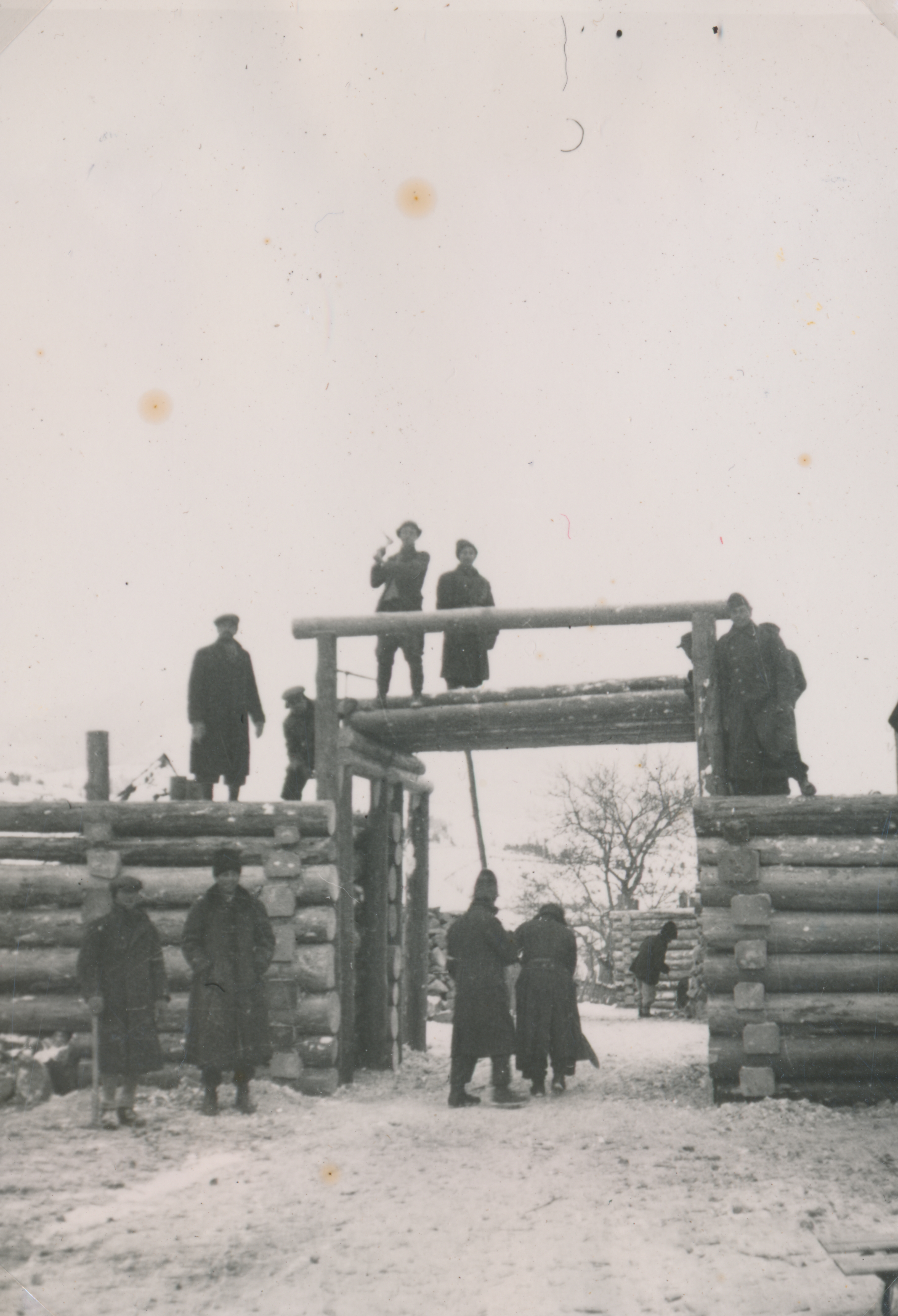 Munkaszolgálatosok és egy tiszt úttorlaszt építenek