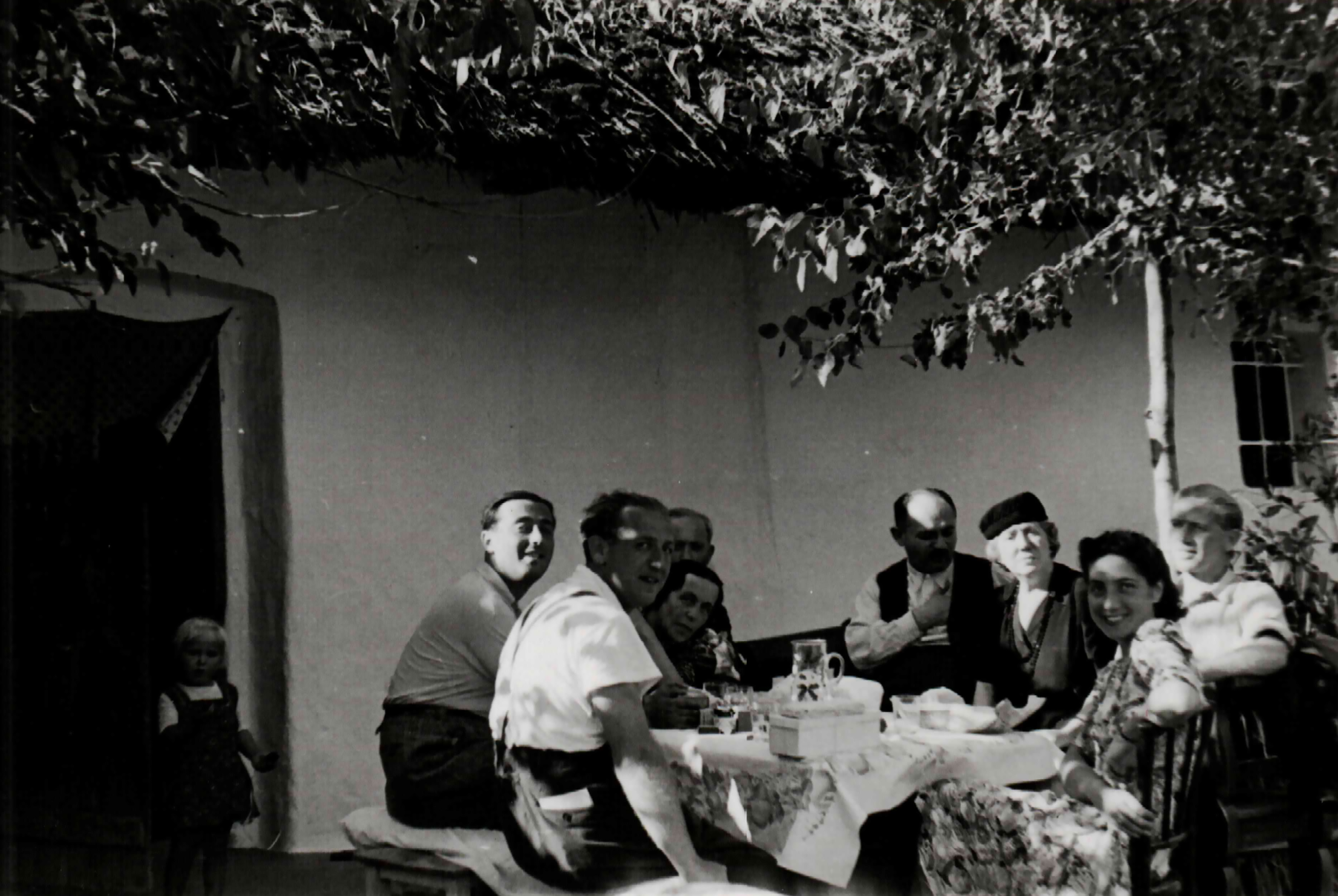 Munkaszolgálatosok és családtagjaik egy asztalnál I. (Középen Szántó Endre, vele szemben édesanyja, Szántó Zsigmondné, jobb oldalon testvére Tessza)