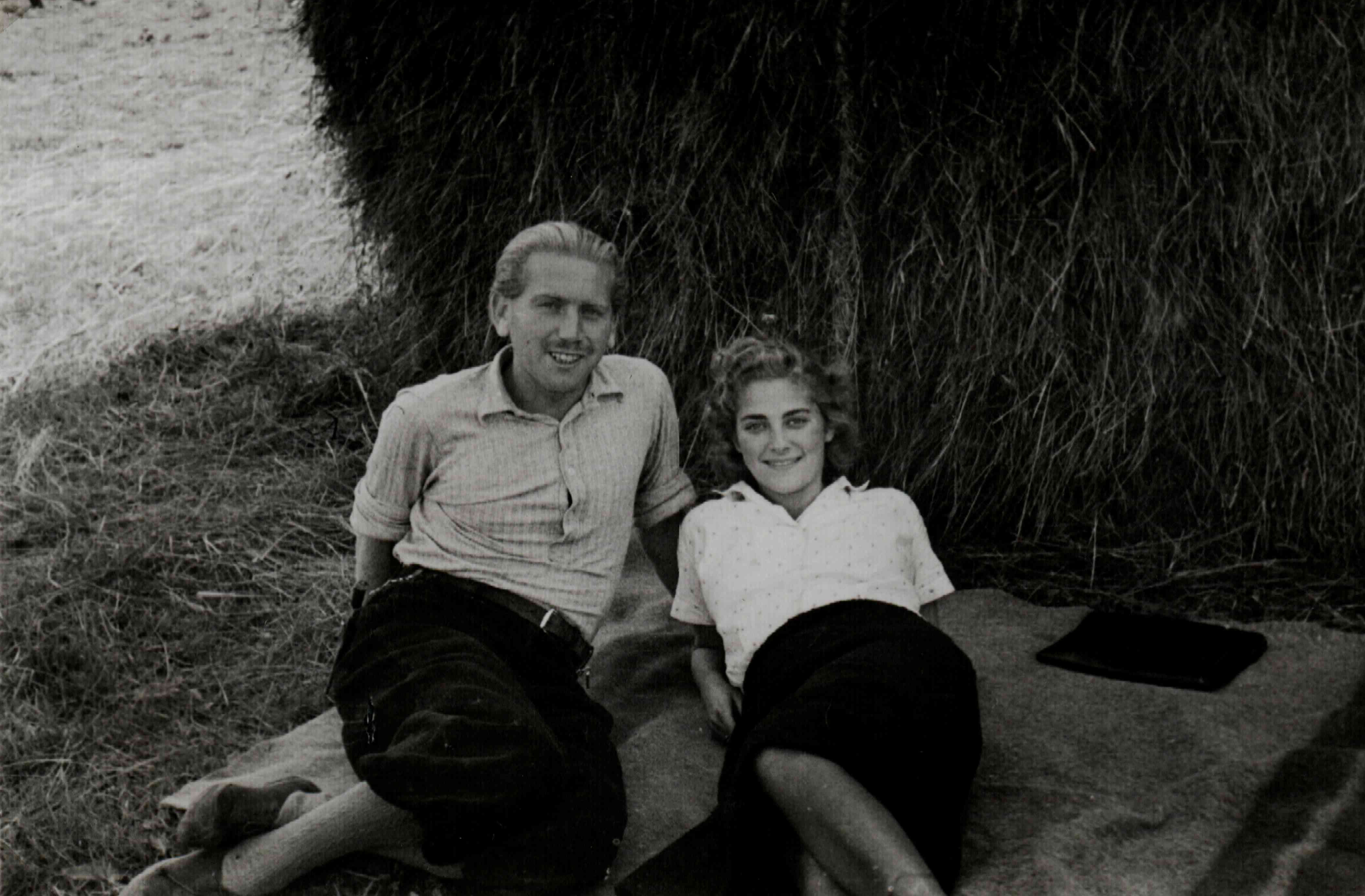 Szántó Ervin munkaszolgálatos és a látogatója egy szénabála előtt