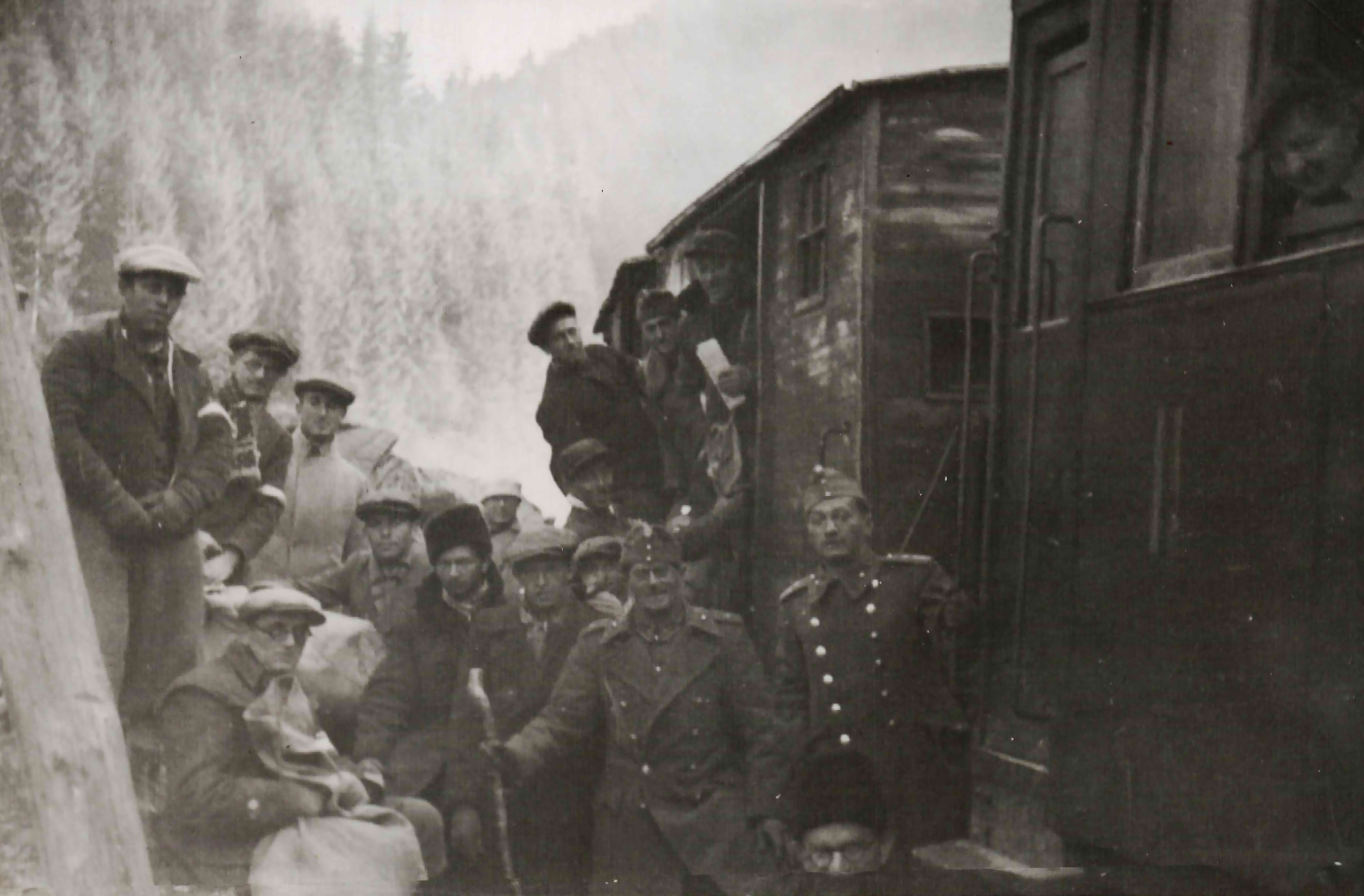 Munkaszolgálatosok és tisztek a vonat mellett