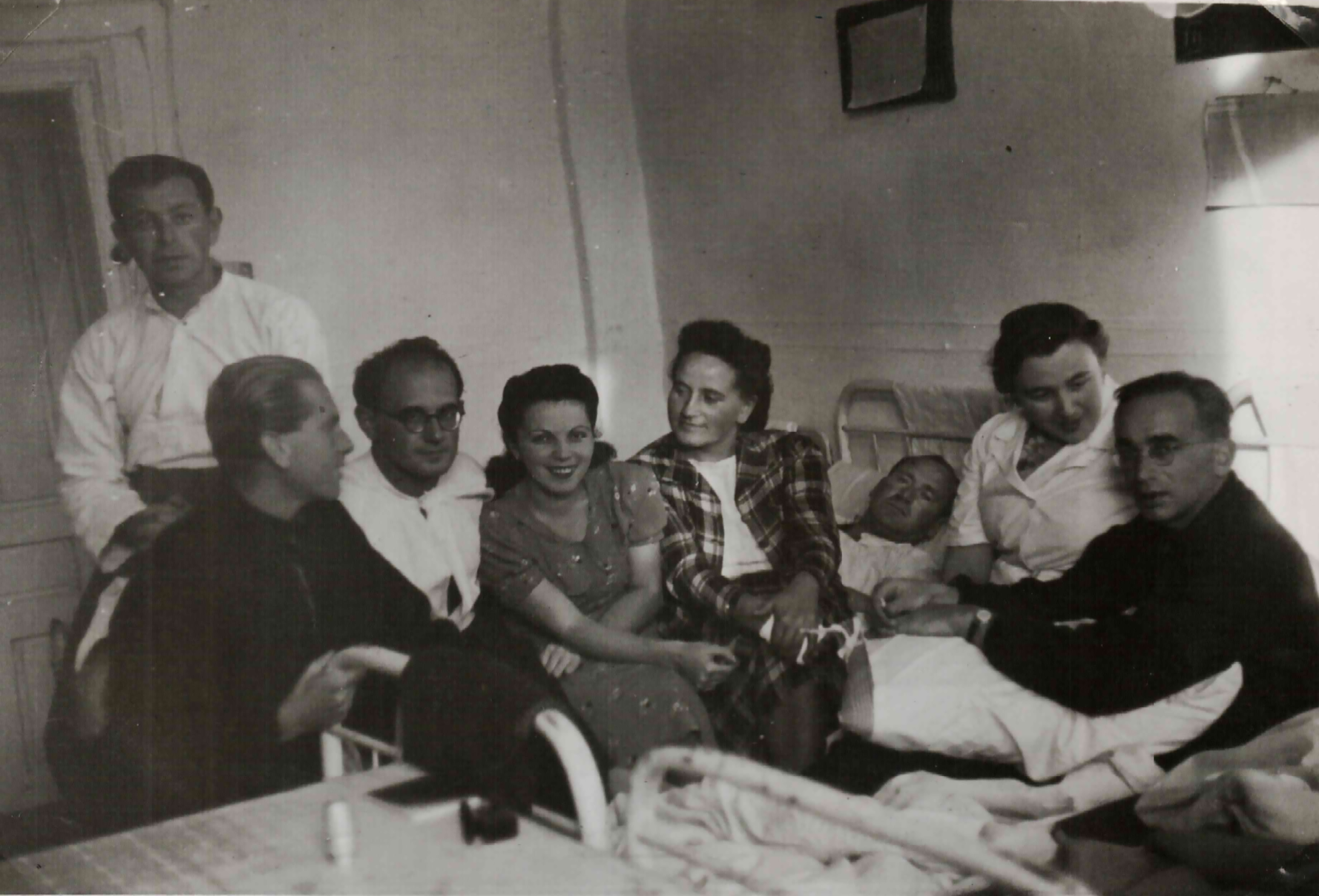 Munkaszolgálatosok a kórházban látogatóikkal II. (Bal oldalon fekete ingben Szántó Ervin, középen kockás kosztümben Korn Médi)