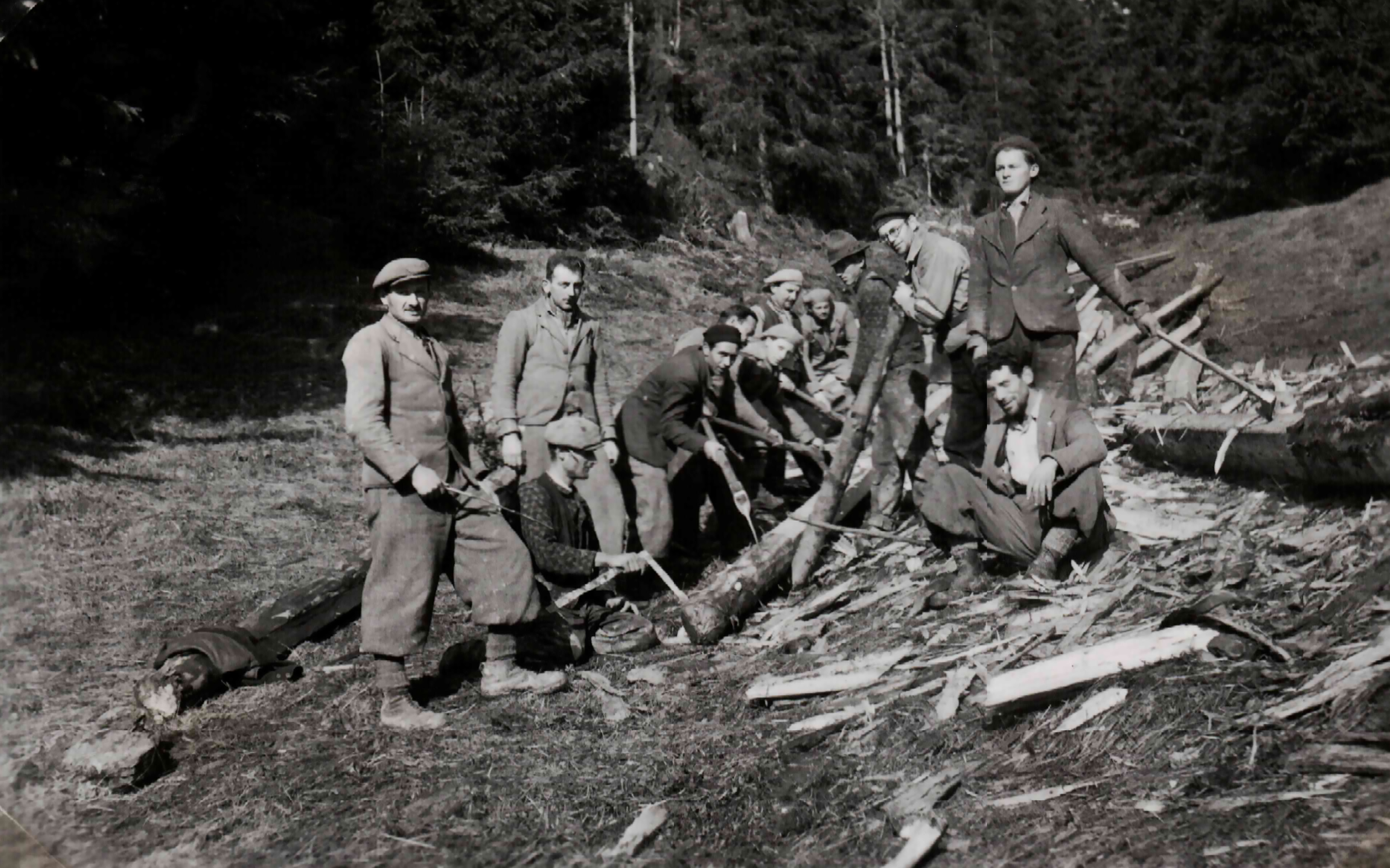 Csoportkép munkaszolgálatosokról fatisztítás közben
