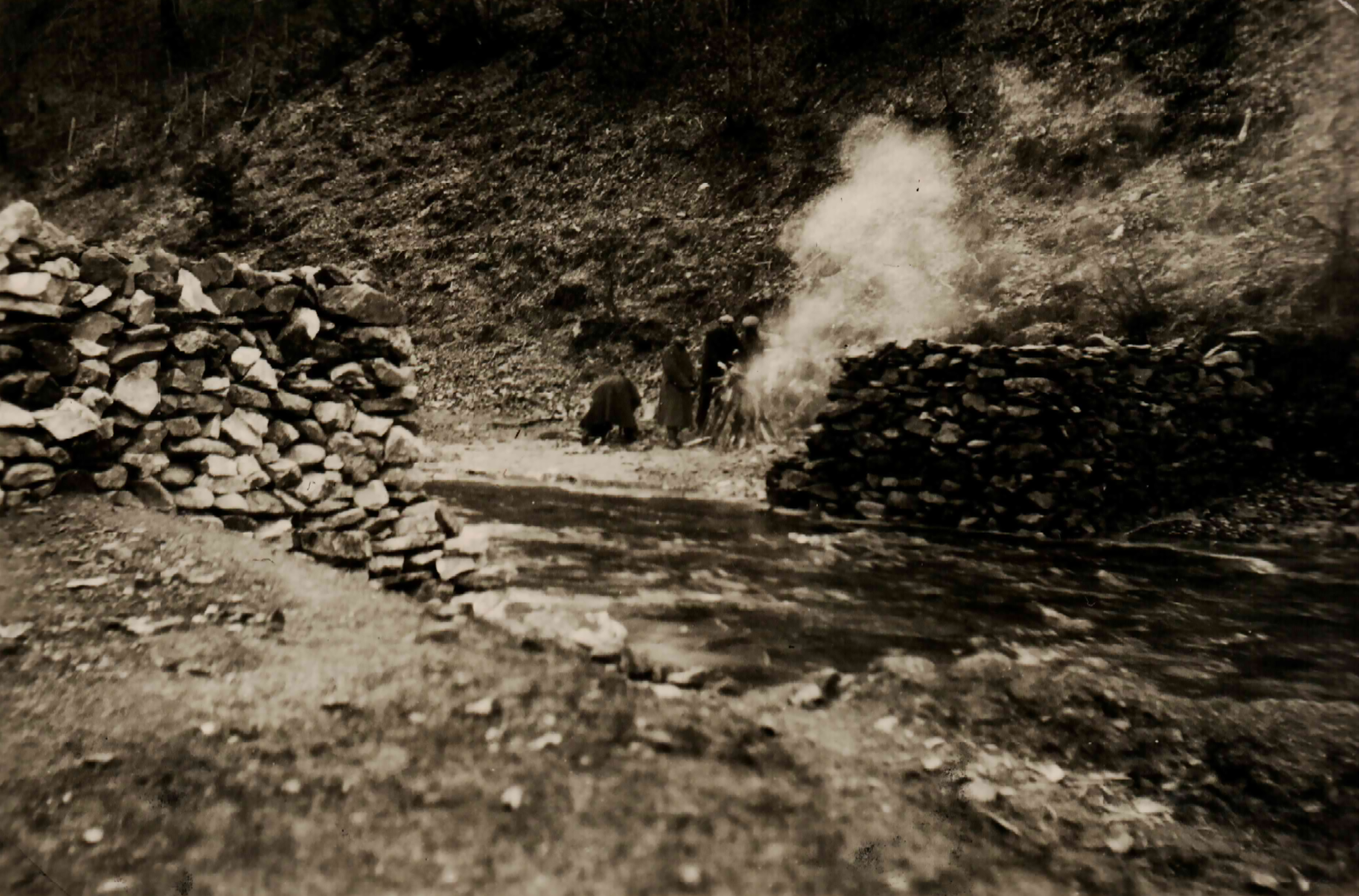 Munkaszolgálatosok kőből épített úttorlasz mögött