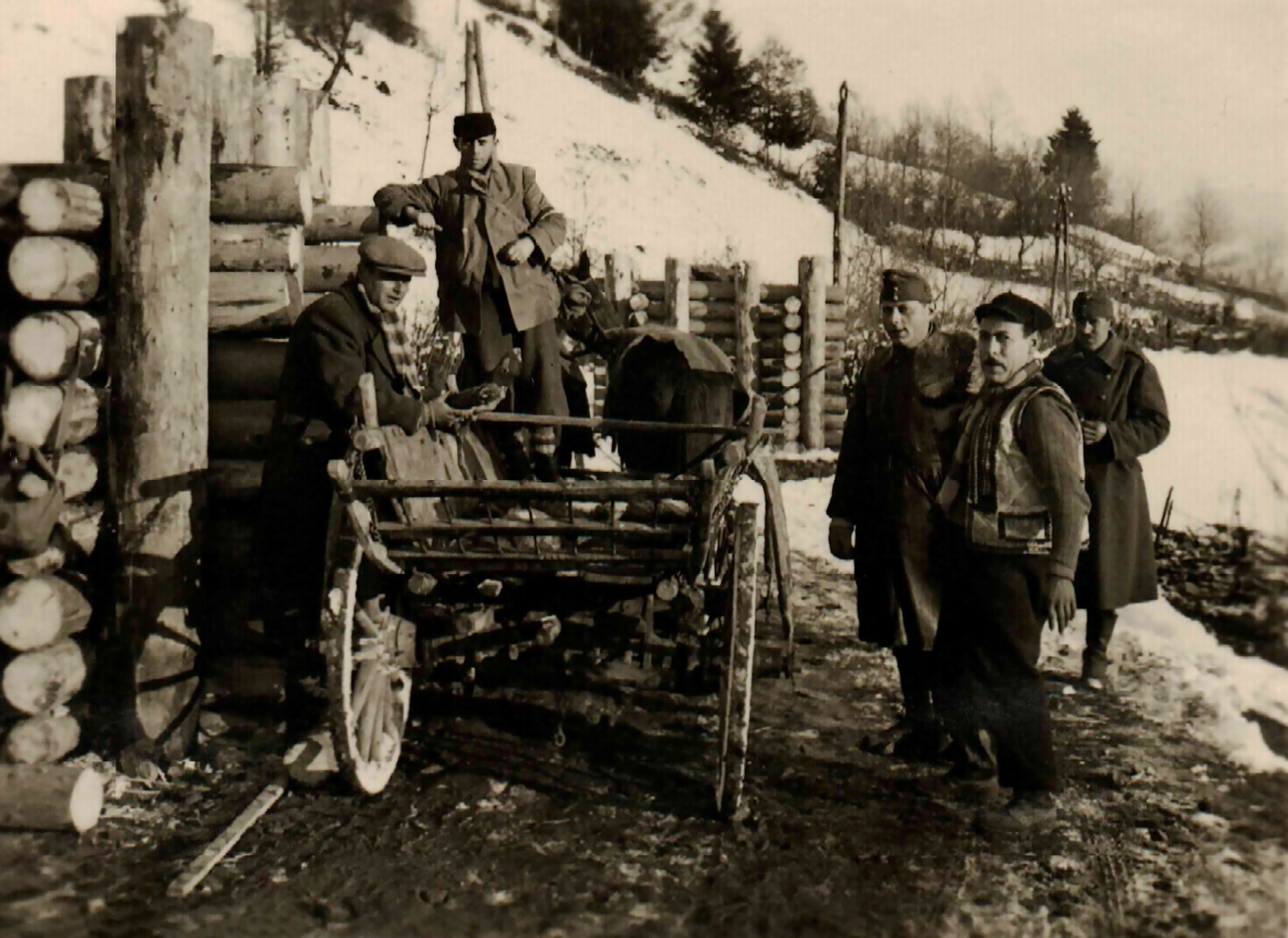 Munkaszolgálatosok és katonák egy szekér mellett az úttorlaszoknál