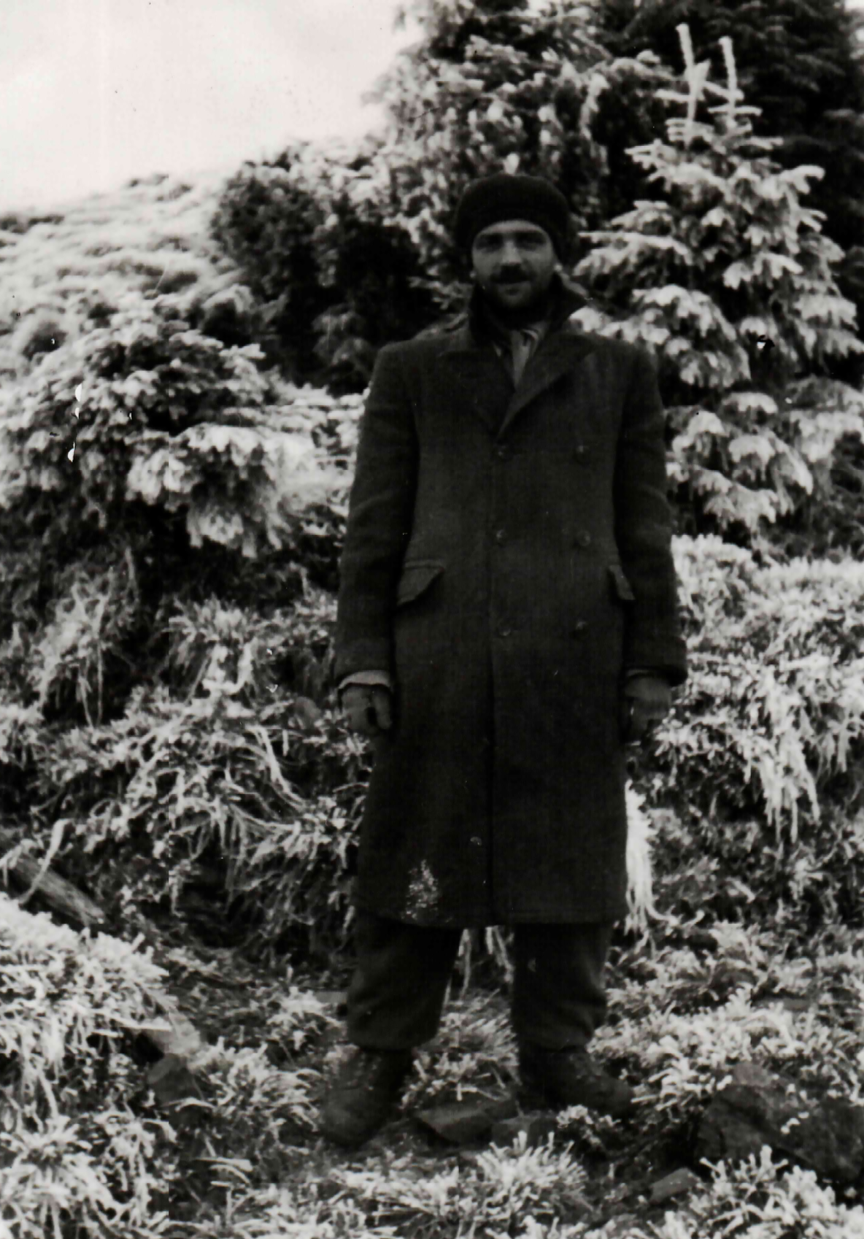 Rákos Ernő munkaszolgálatos fagyott fenyő előtt áll