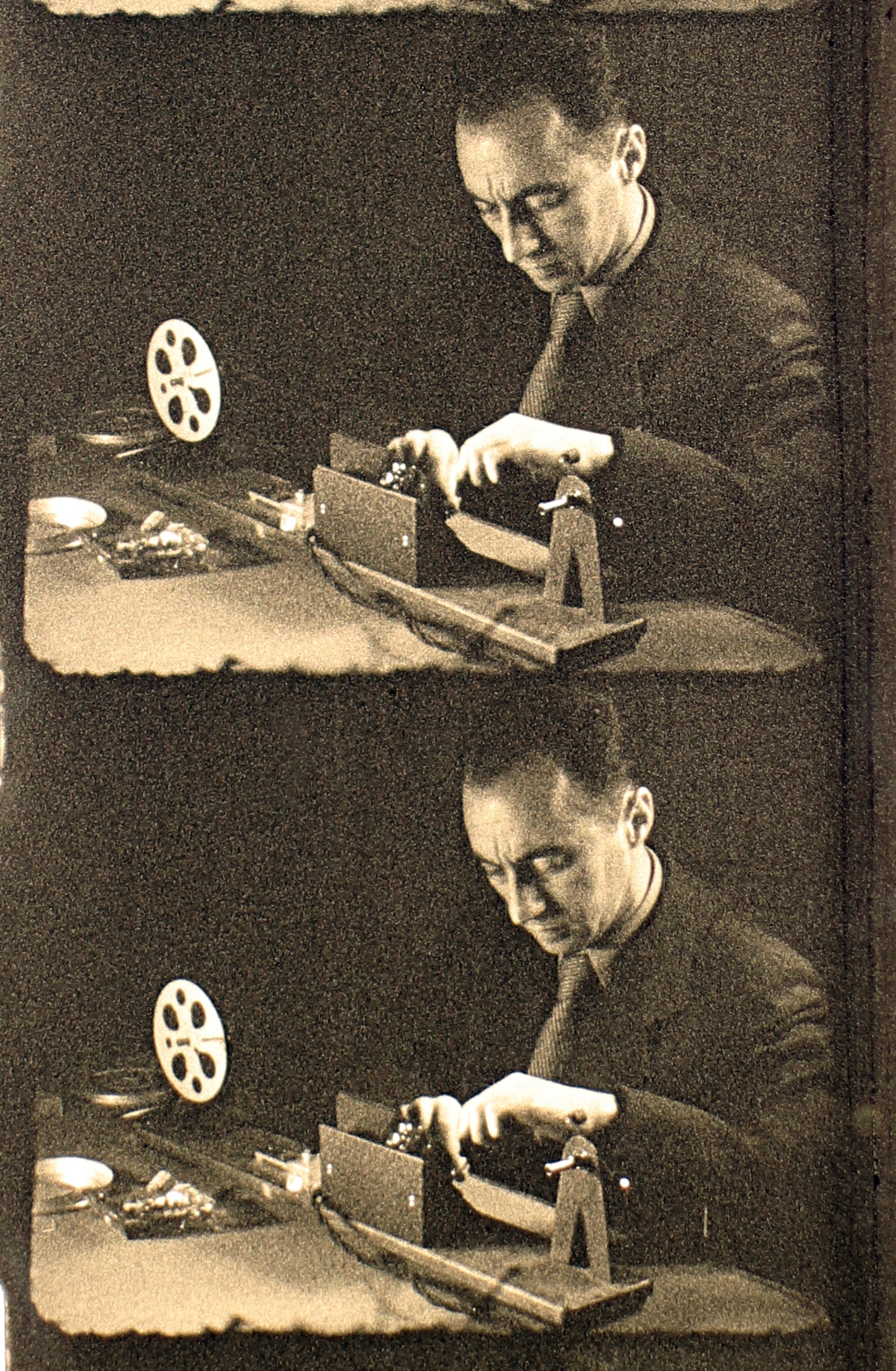 Pető György 8 mm-es filmfelszerelésével filmet vág otthonában
