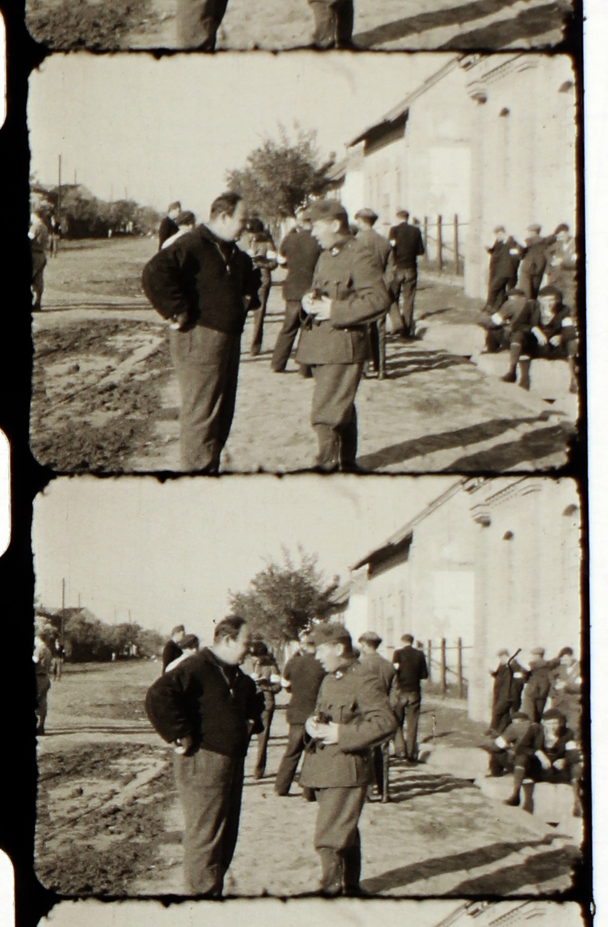 Egy katona egy munkaszolgálatossal beszélget, köröttük munkaszolgálatosok