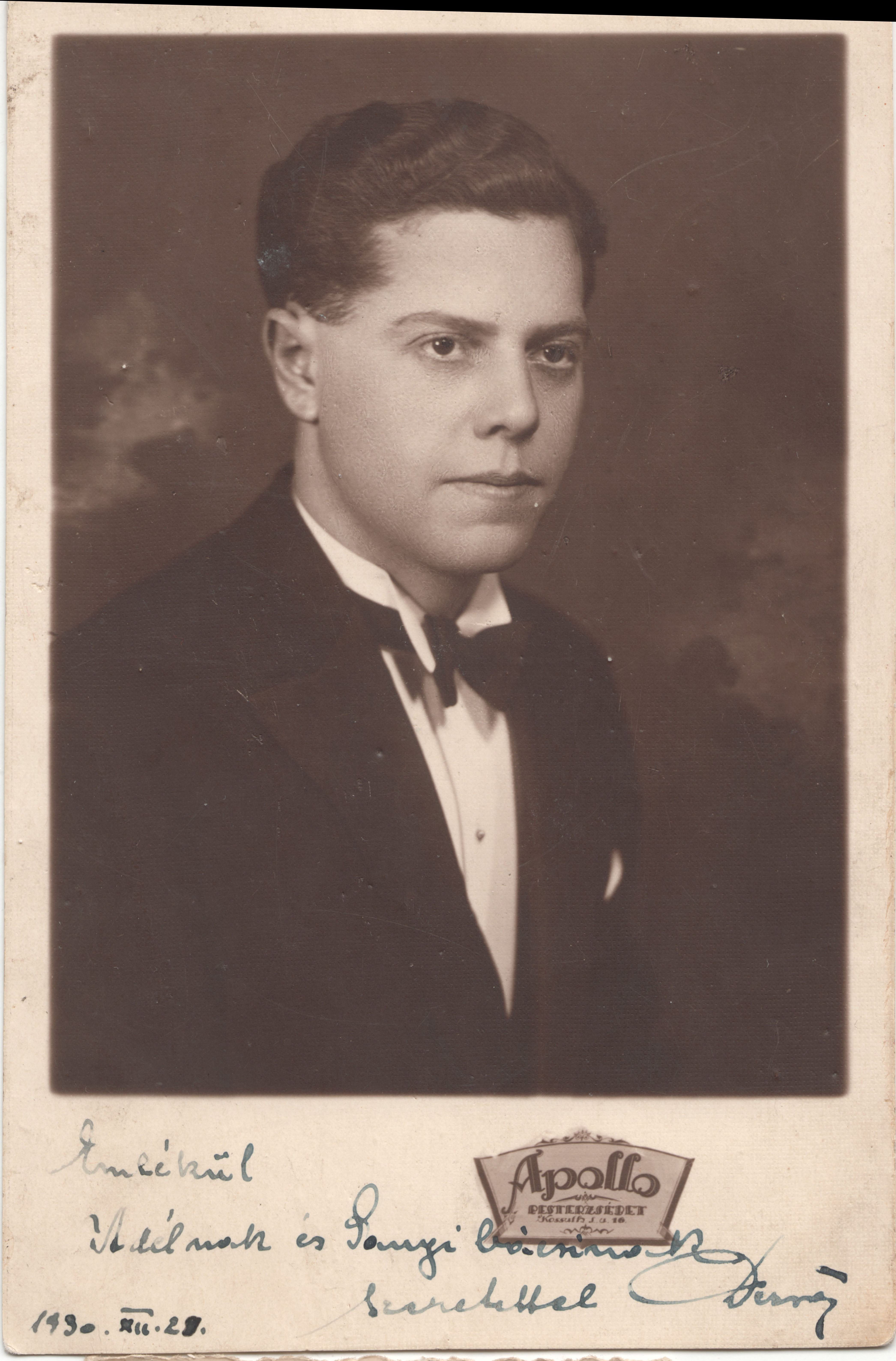 A fotó előlapjának alsó részén kézírásos felirat: "Emlékül Adélnak és Sanyi bácsinak szeretettel, Dezső, 1930.XII.25."