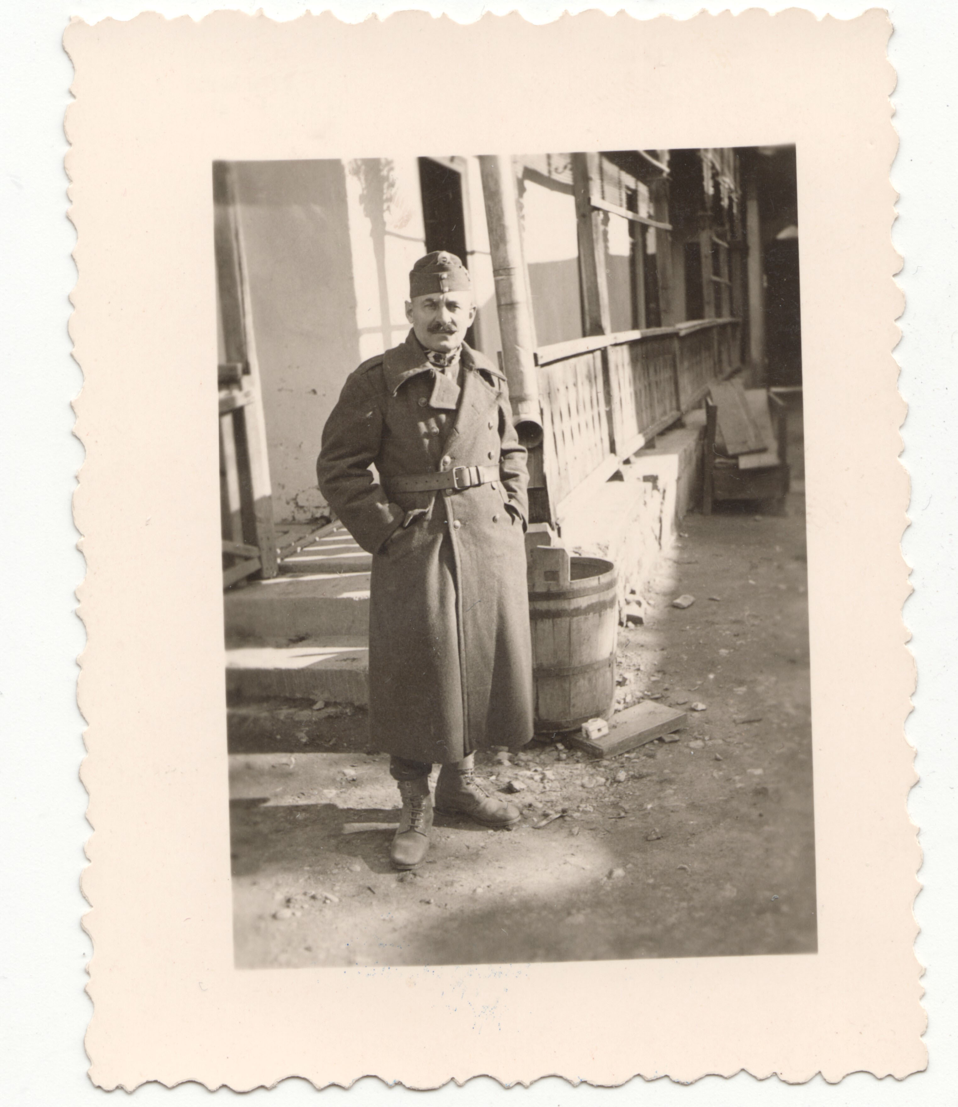 Munkaszolgálatosokat felügyelő honvédtiszt egy tornácos ház előtt