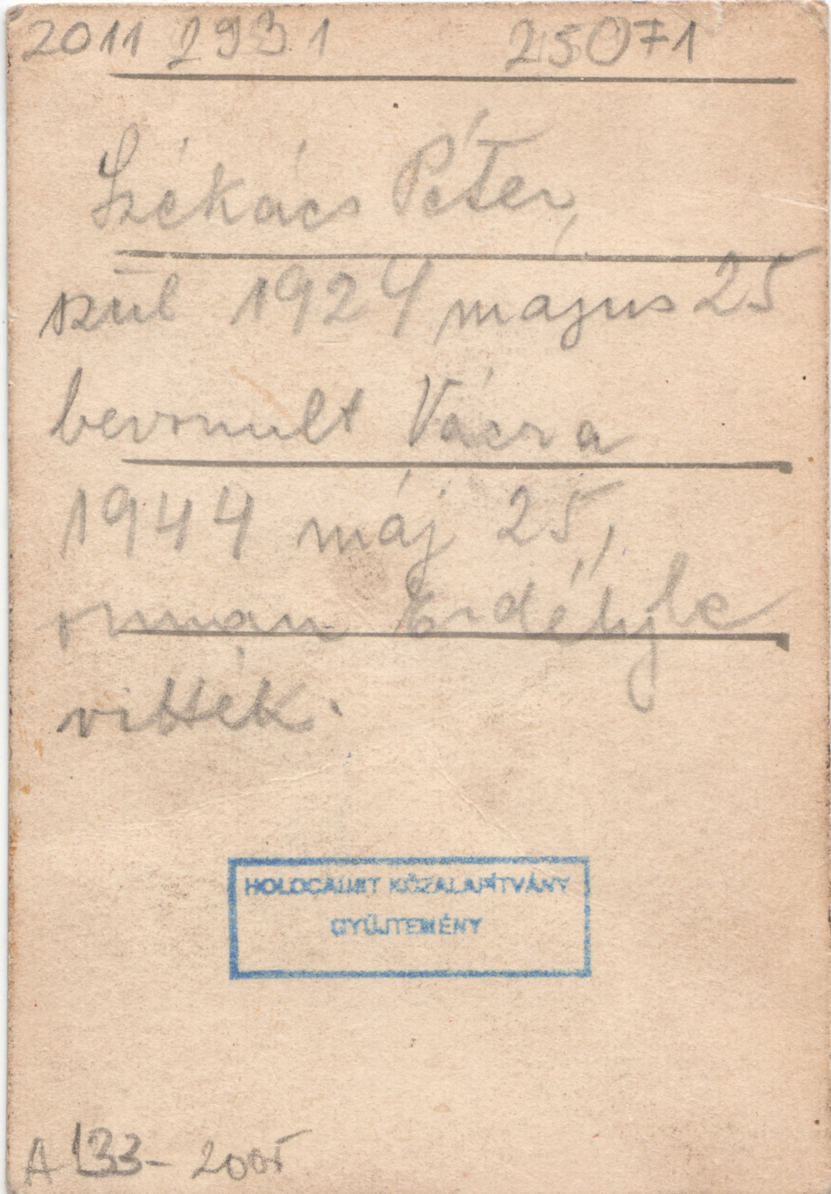 "Székács Péter, szül 1924 május 25 bevonult Vácra 1944 máj 25, onnan Erdélybe vitték."