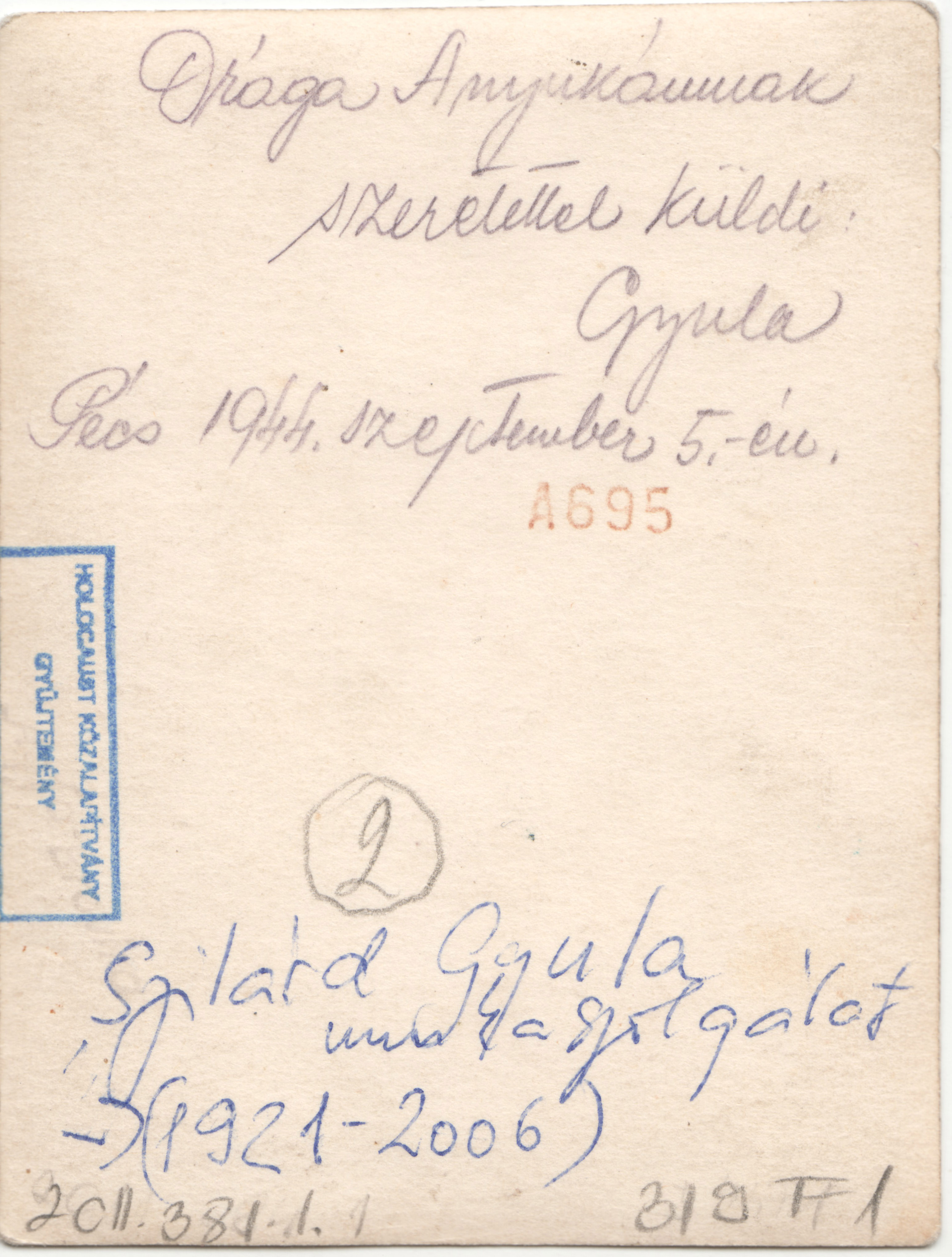 "Drága Anyukámnak szeretettel küldi: Gyula. Pécs, 1944 . szeptember 5-én." "Szilárd Gyula (1921-2006) munkaszolgálat."