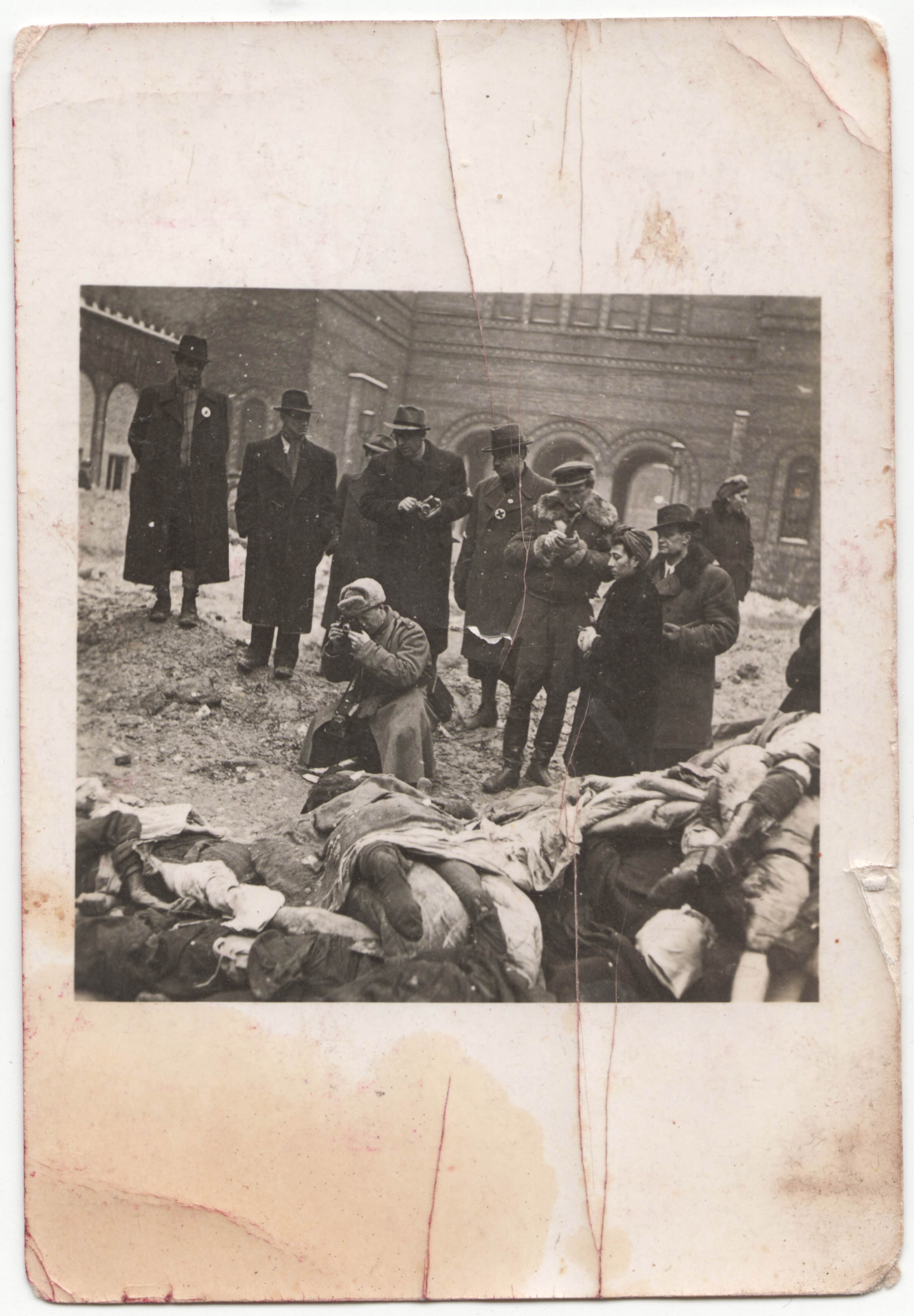 A Dohány utcai zsinagóga udvarán talált holttestekről 1 (amatőr felvételek, 1945.01.18.). A nácizmus bűneit kivizsgáló bizottság orvosokkal, szovjet fotósokkal, fotóriporterekkel közös szemléjekor készült felvétel.
