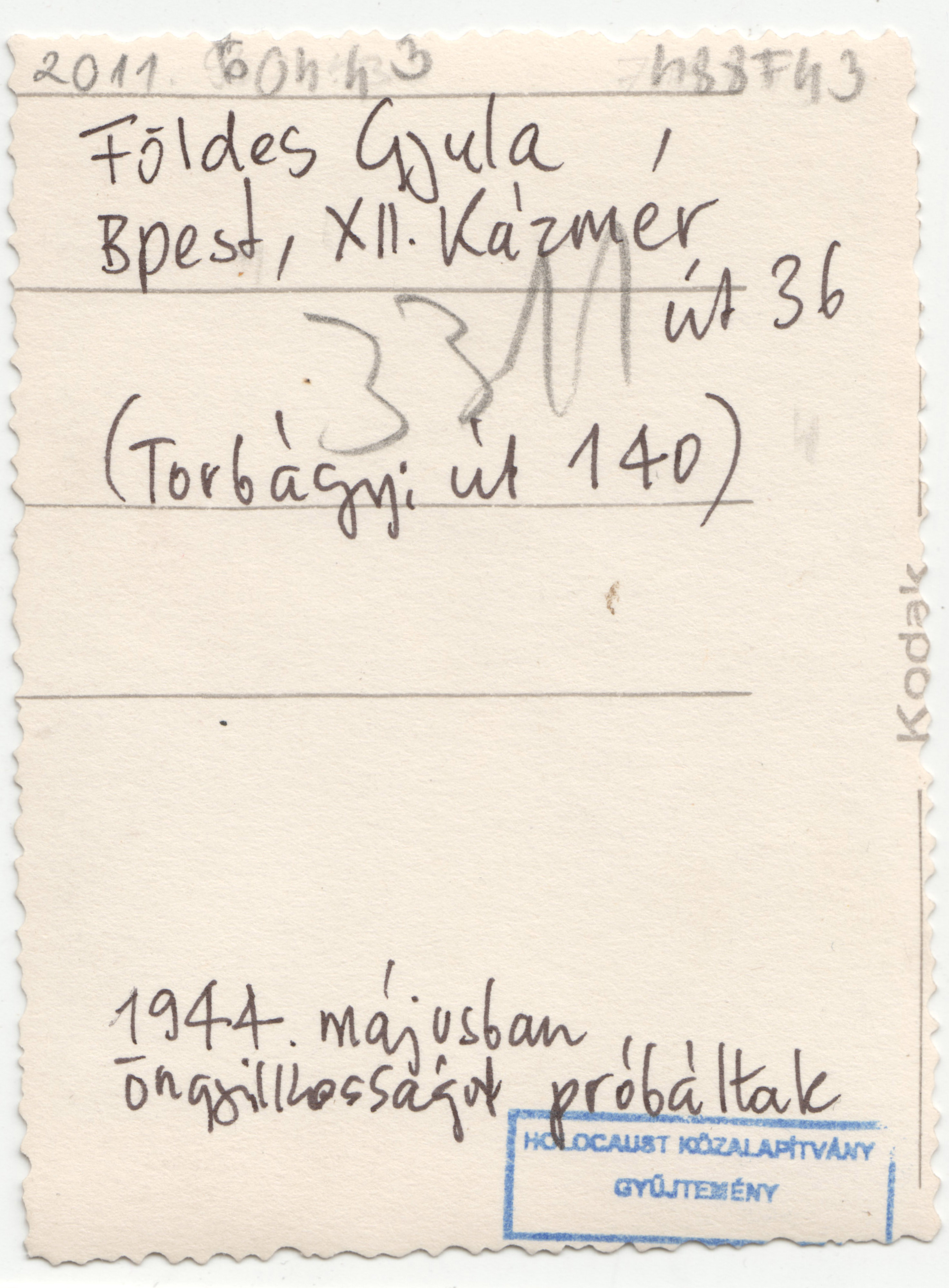 Földes Gyula igazolványképének hátoldalán kézzel írt szöveg