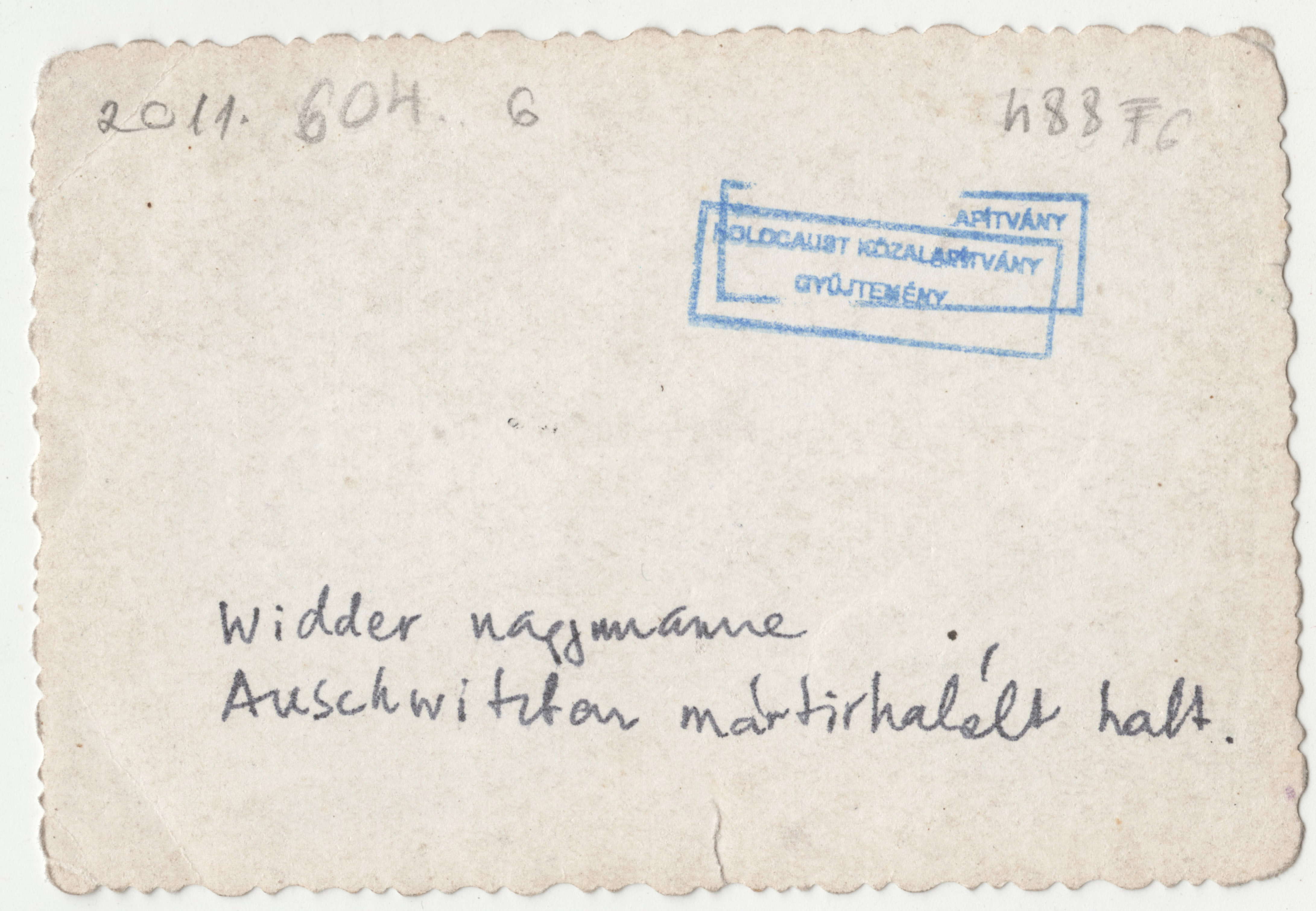 Widder nagymama fotójának hátoldalán kézzel írt szöveg