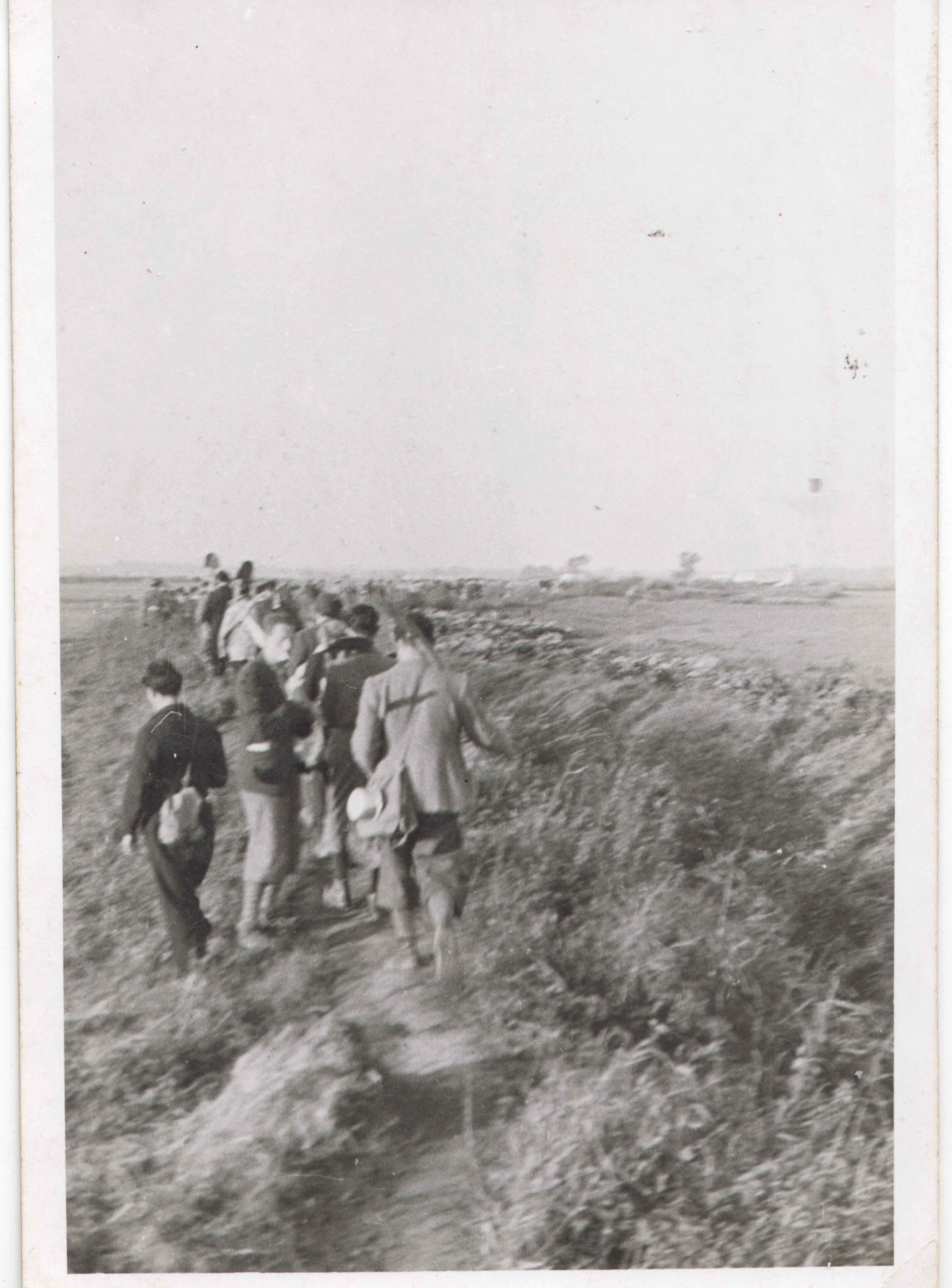 Munkaszolgálatosok egy ösvényen gyalagolnak