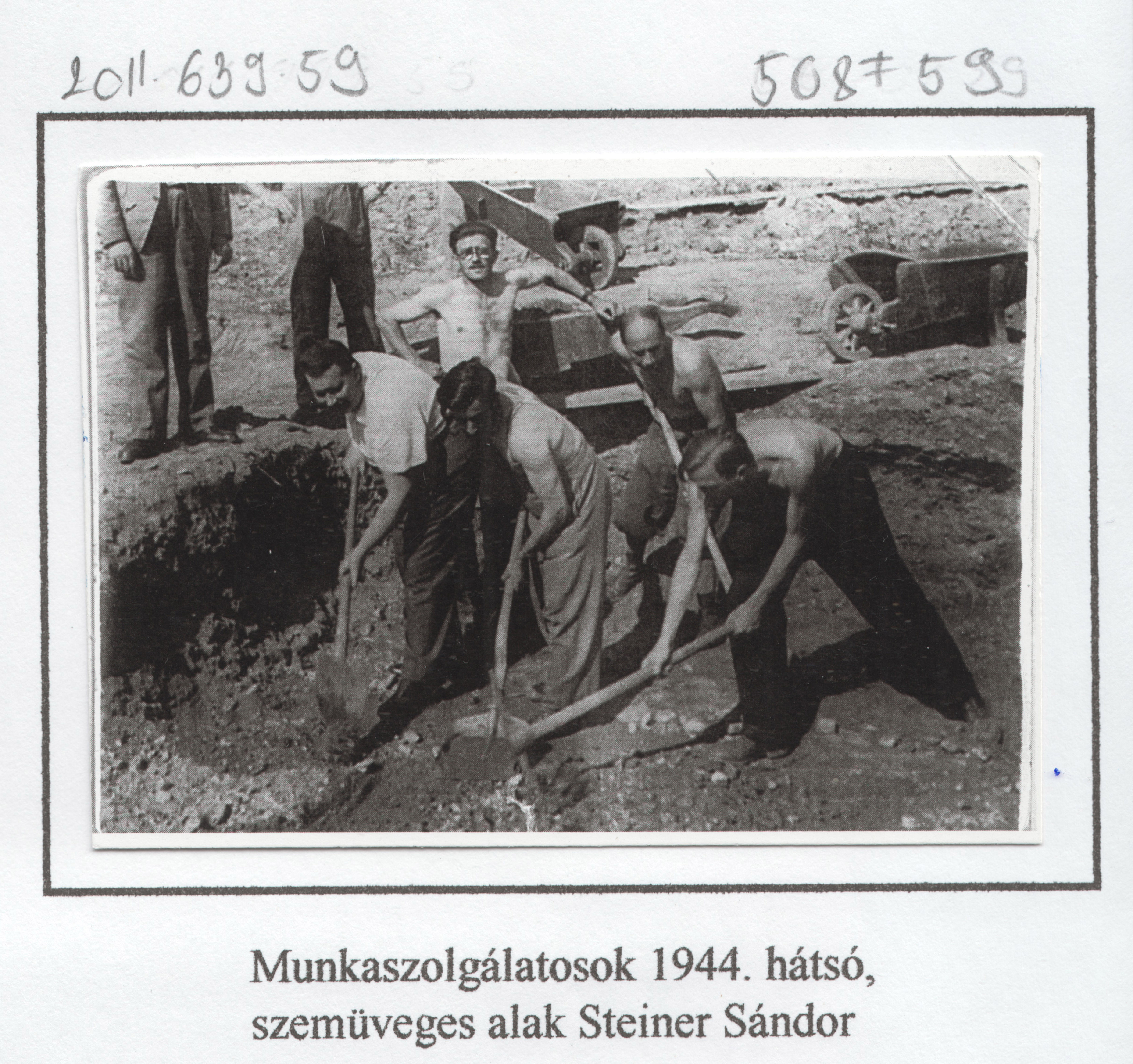 Jegyzetelt fotó munkaszolgálatosokról ásás közben, köztük Steiner Sándor (szemüvegben)