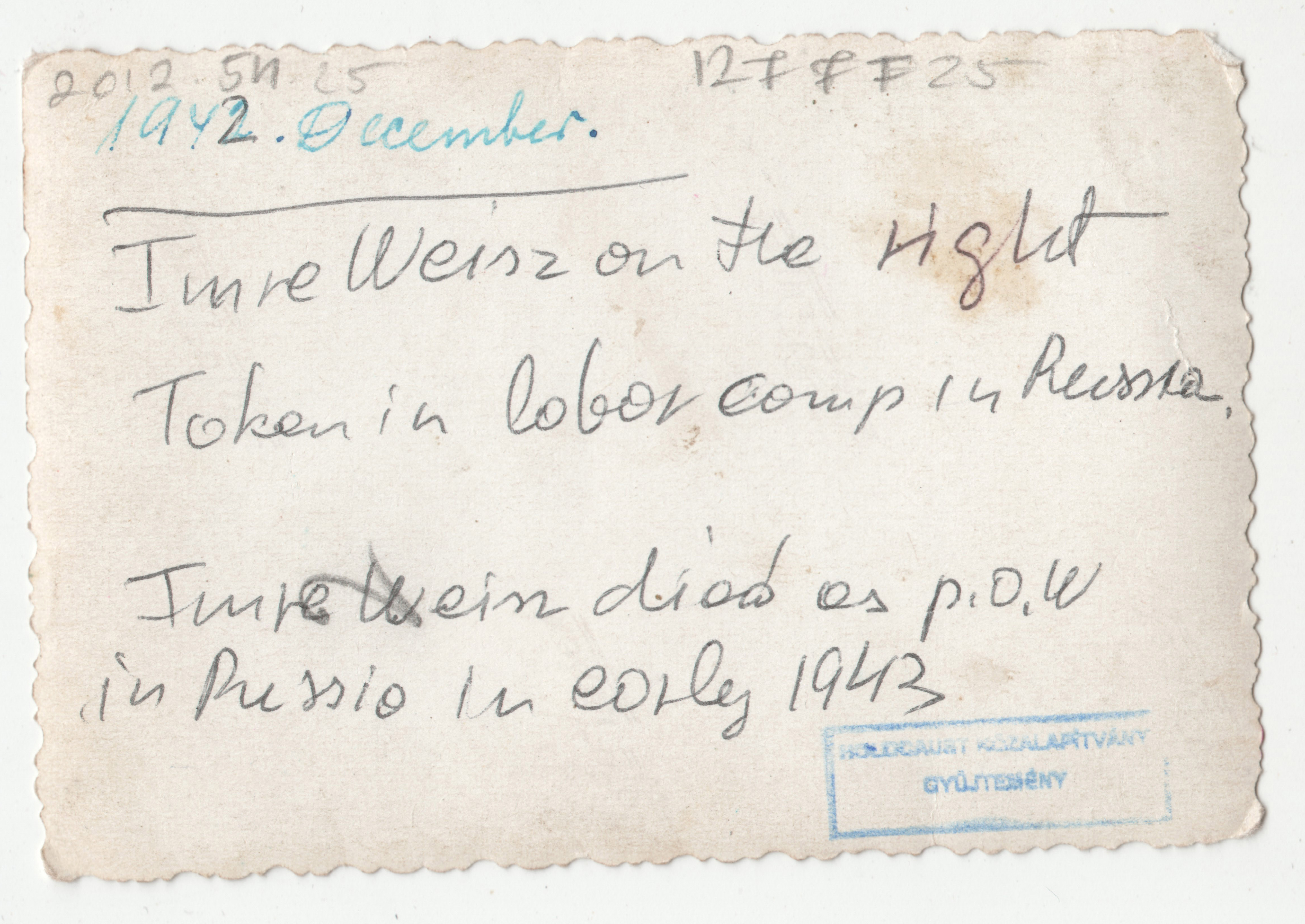 Öt munkaszolgálatos hátoldalán kézzel írt szöveg