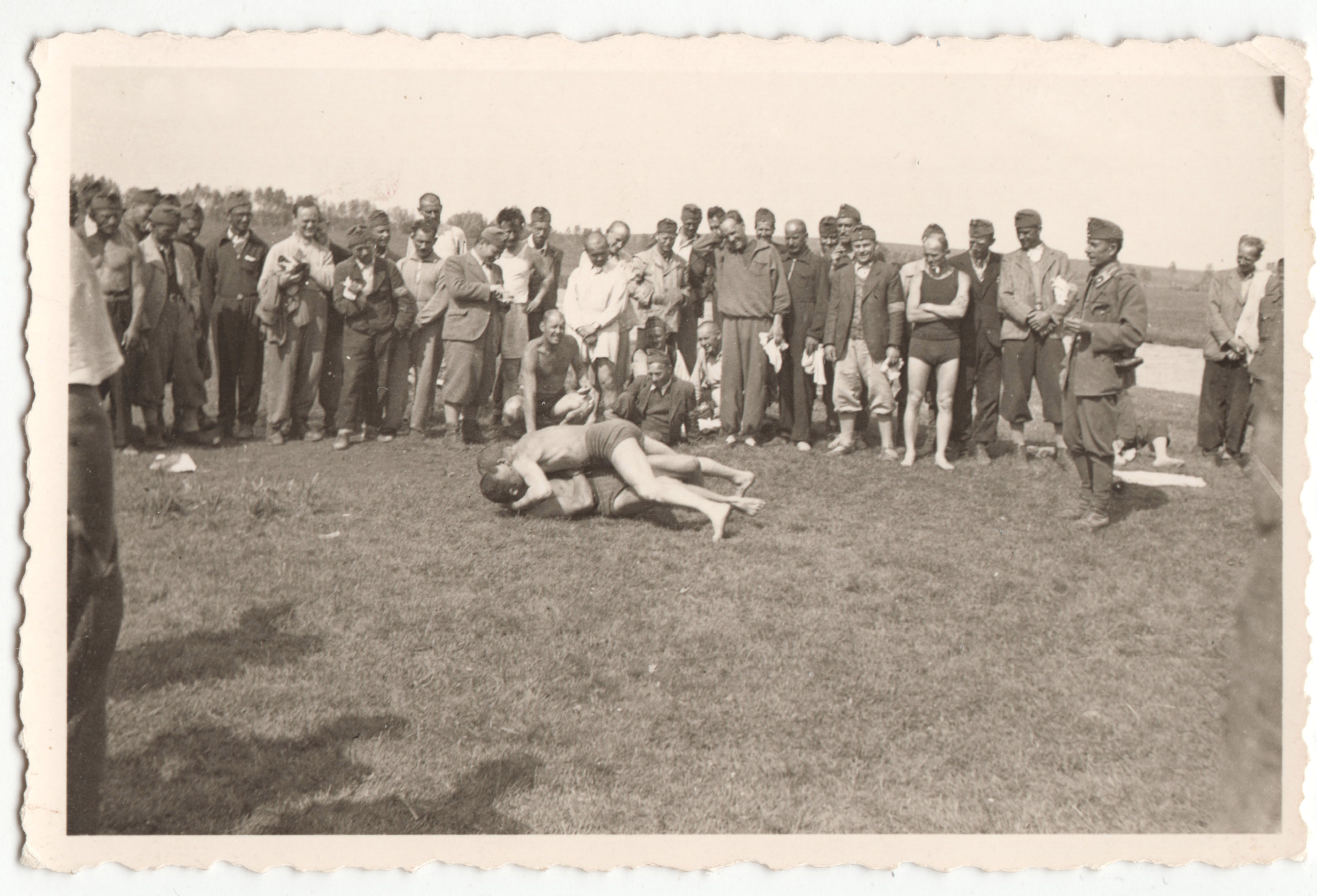 Munkaszolgálatosok egy réten kép előtérben kér bírkózó férfiakkal