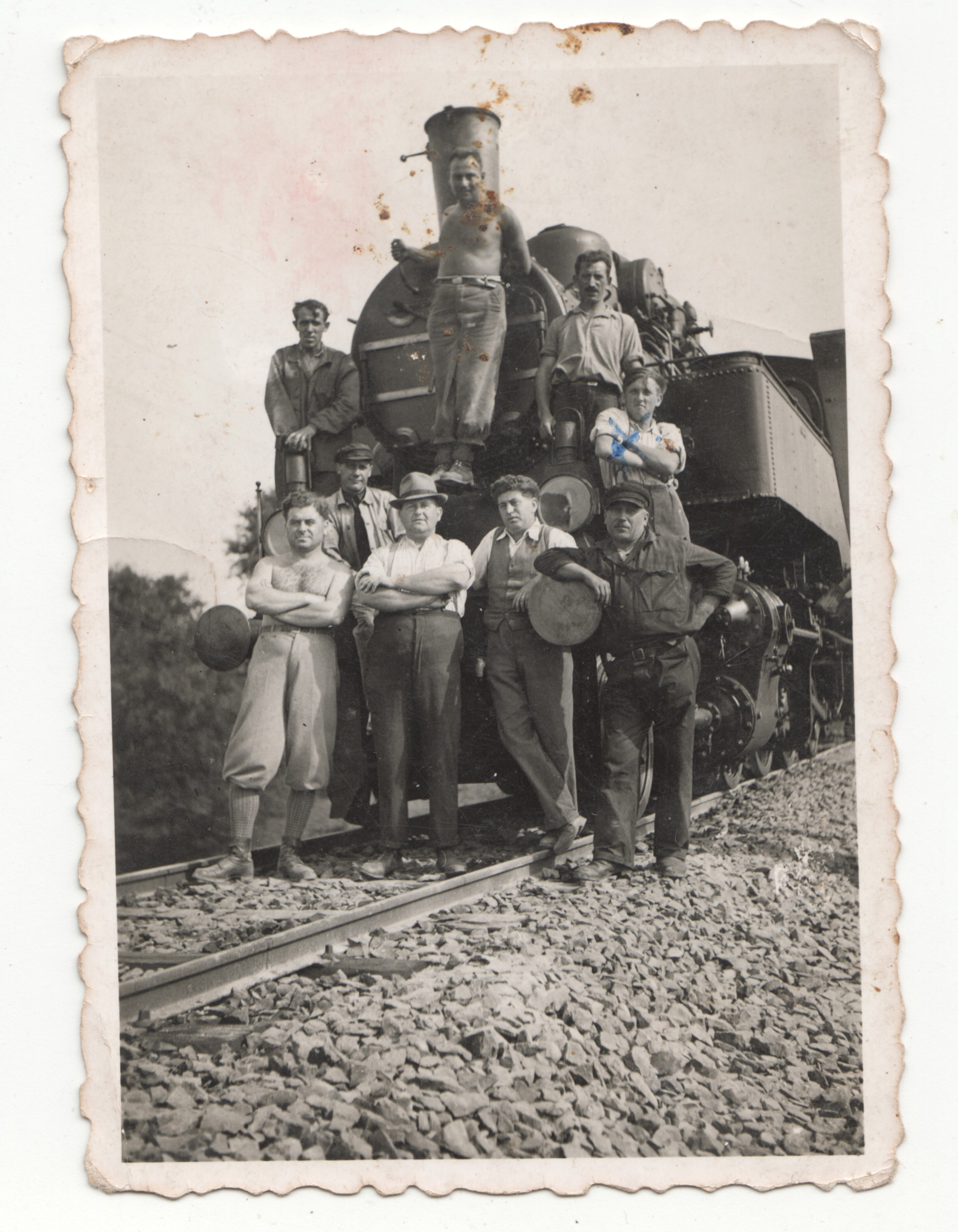 Csoportkép munkaszolgálatosokról mozdony előtt