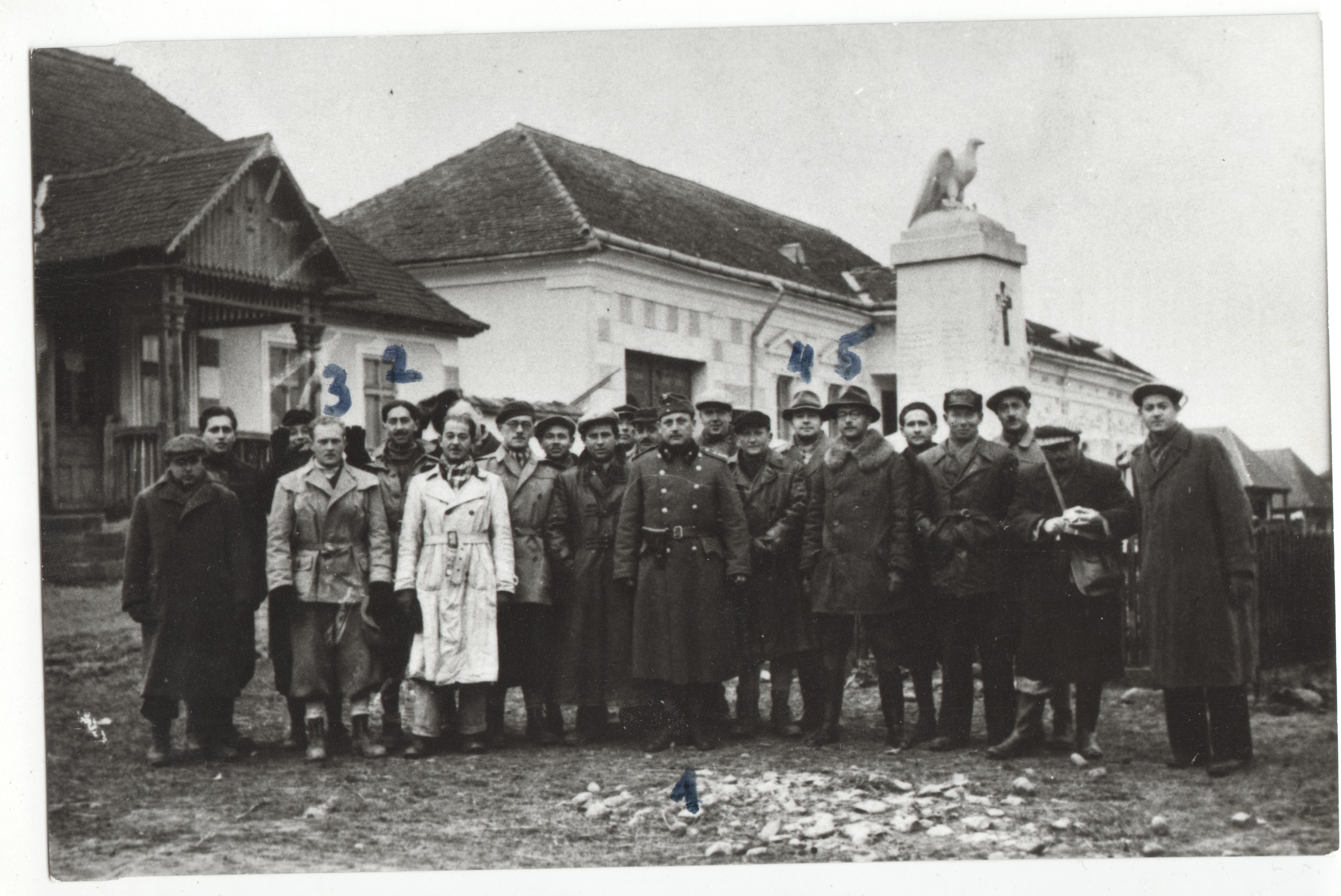 Munkaszolgálatosok Dr. Ábrai Zsigmonddal együtt egy köztéri szobor előtt