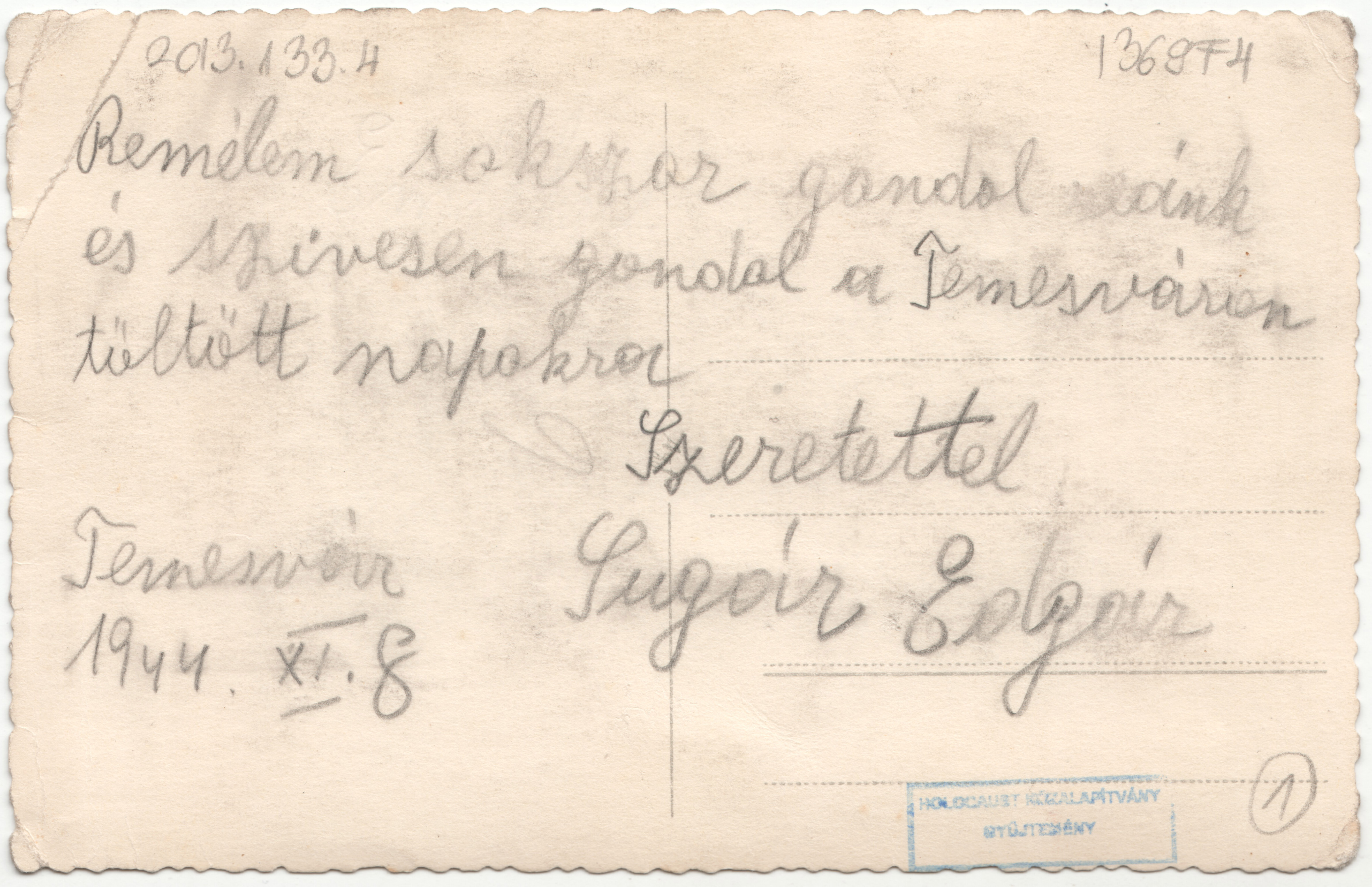 "Remélem, sokszor gondol ránk és szívesen gondol a Temesváron töltött napokra. Szeretettel Sugár Edgár Temesvár 1944. XI. 8."