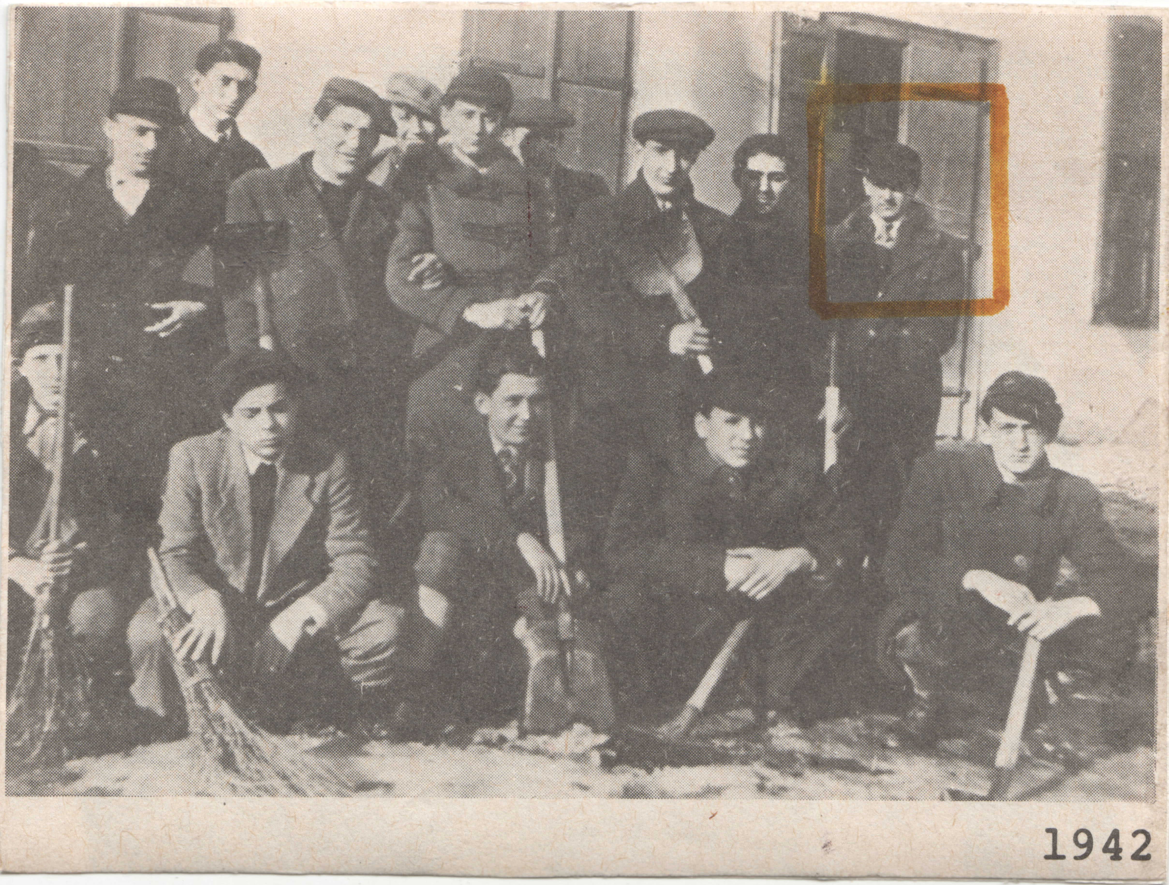 Csoportkép munkaszolgálatosokról civil ruhában, szerszámokkal