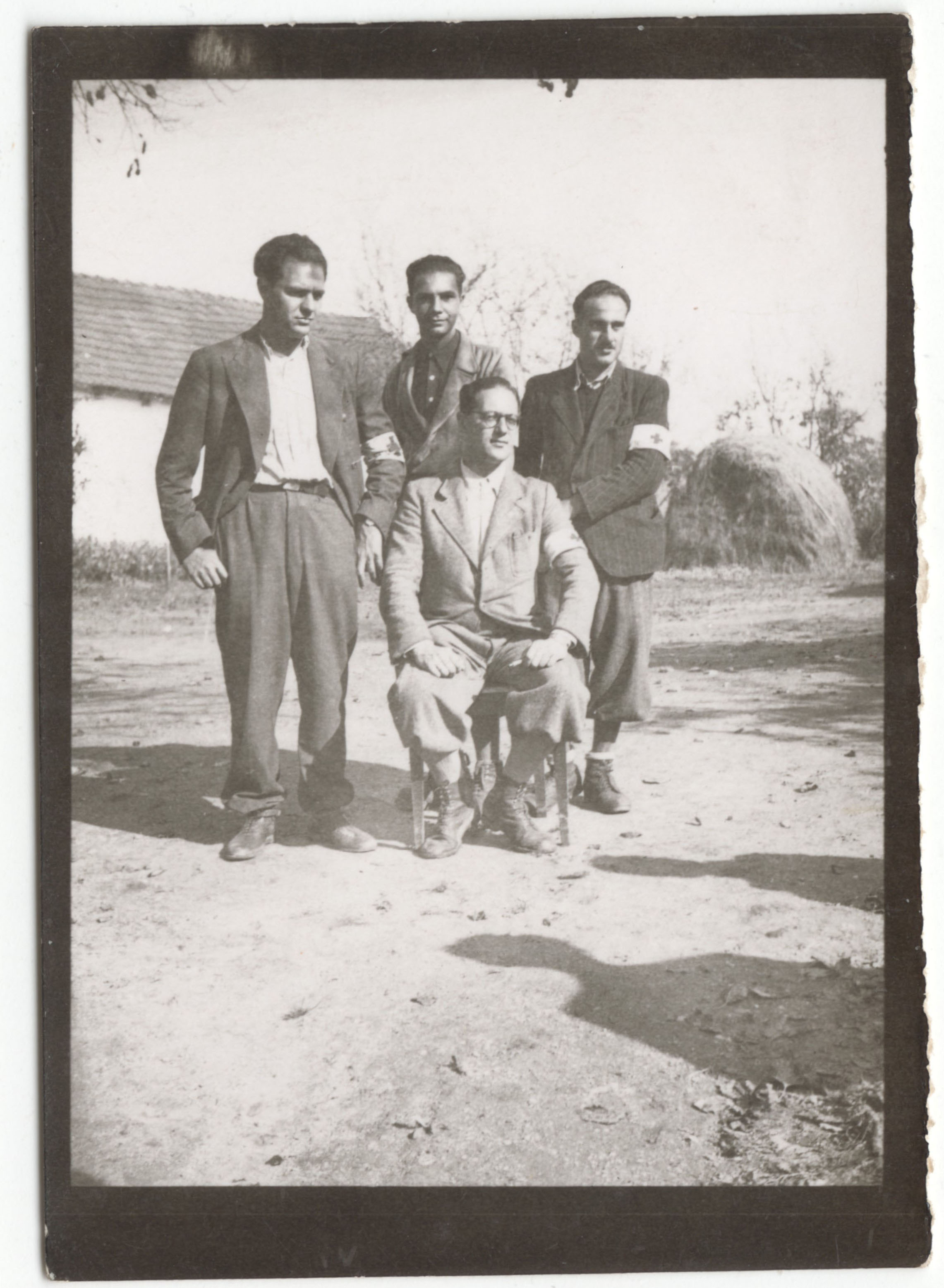 Csoportkép, melyen jobb szélen Gerő Andor (1914-2012) munkaszolgálatos látható három századtársával, civil ruhában, vöröskeresztes karszalaggal egy ház előtt, háttérben egy szénaboglyával.