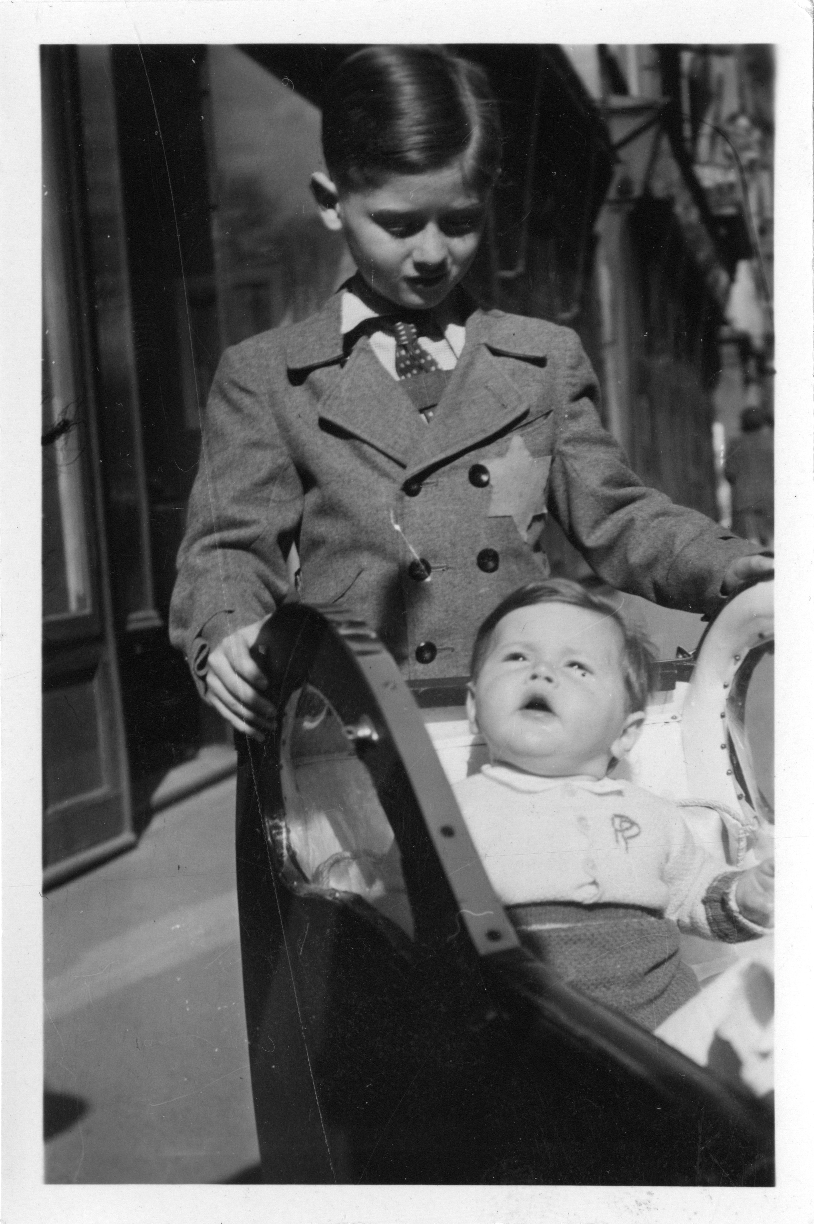Pártos Péter testvérét, Pártos Pált tolja babakocsijában, mellén sárga csillaggal